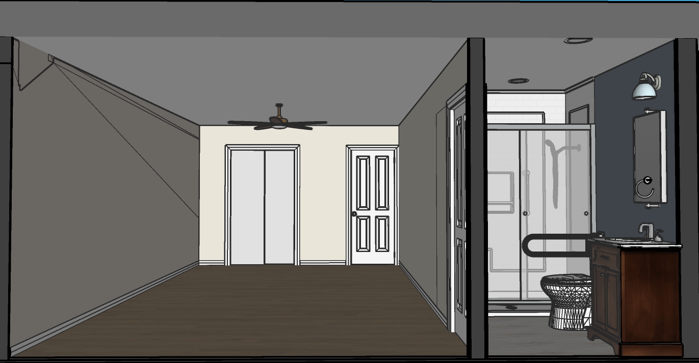 the floor on the left is lvp in a walnut color the walls are revere pewter by benjamin moore the closet doors are sliding mirror slabs the floor on the right in the bathroom is lvt 12x24 in a brick pattern the back wall is hale navy and the shower is a subway tile with a light blue shadow box on the walls