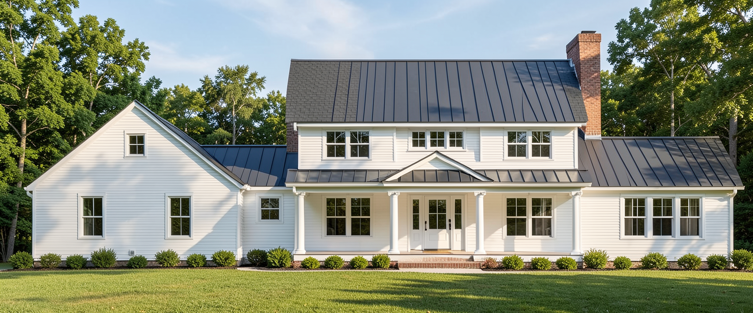 traditional farmhouse with dark gray metal roof at porch only dark gray shingle roof everywhere else white windows white siding decorative white columns wood door main roof has shingles stone veneer chimney