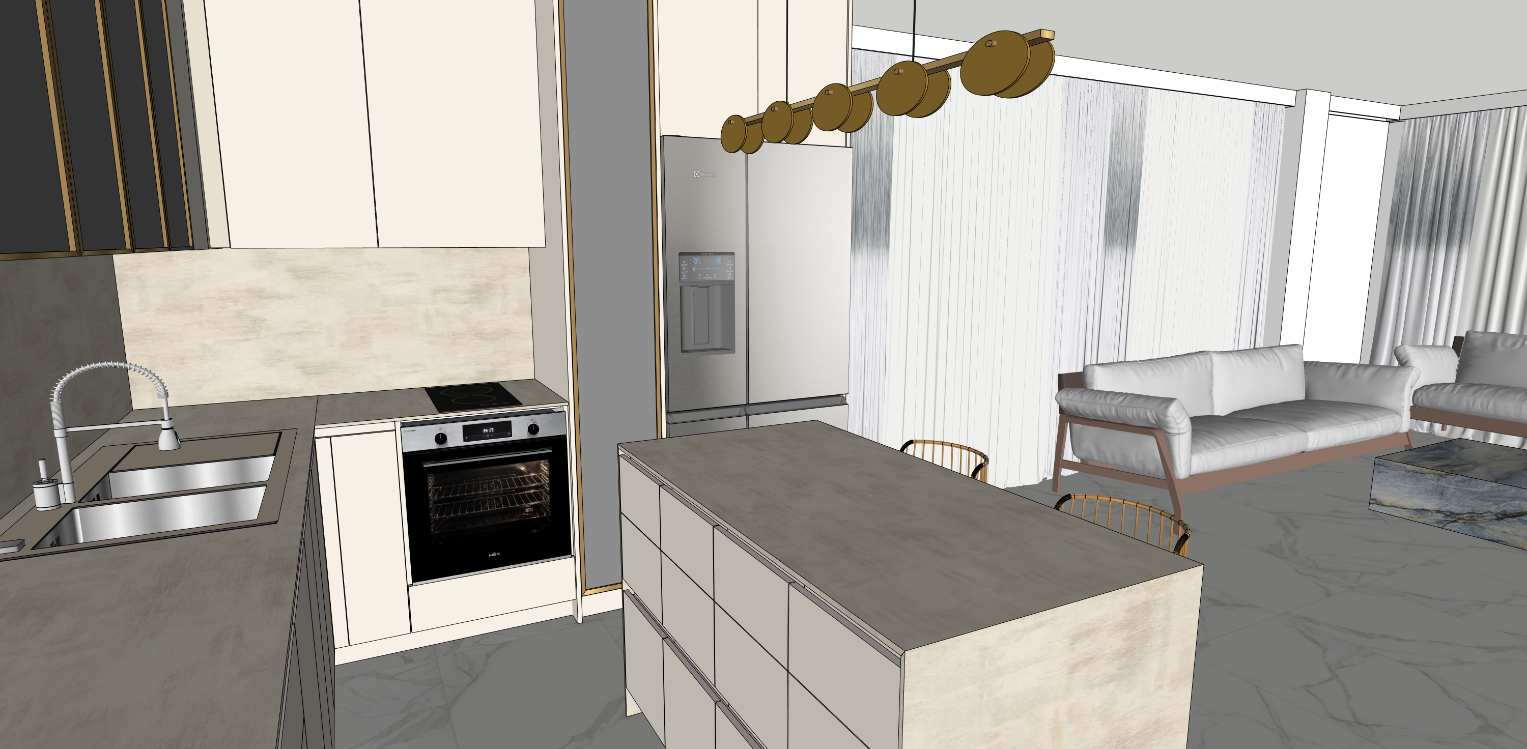 create a modern kitchen and living area with a cozy yet elegant atmosphere use soft beige tones for the cabinets and island complementing with light gray countertops the flooring should feature a polished gray marble look design the appliances in sleek stainless steel incorporate a warm brass tone for the pendant lighting above the island add white sheer curtains flowing by the windows enhancing natural light the sofas should have soft white upholstery with light wood framing scatter a plush navy and gray rug under the seating area and complete the space with warm ambient lighting creating a welcoming and stylish environment