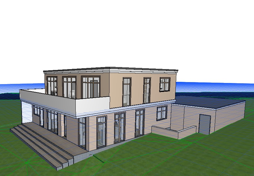 erstelle ein realistisches bild f ge 2 3 kleine v gel am himmel die fensterrahmen sollen weiss sein die fassadenfarbe grau f ge eine frau auf dem balkon im ersten obergeschoss