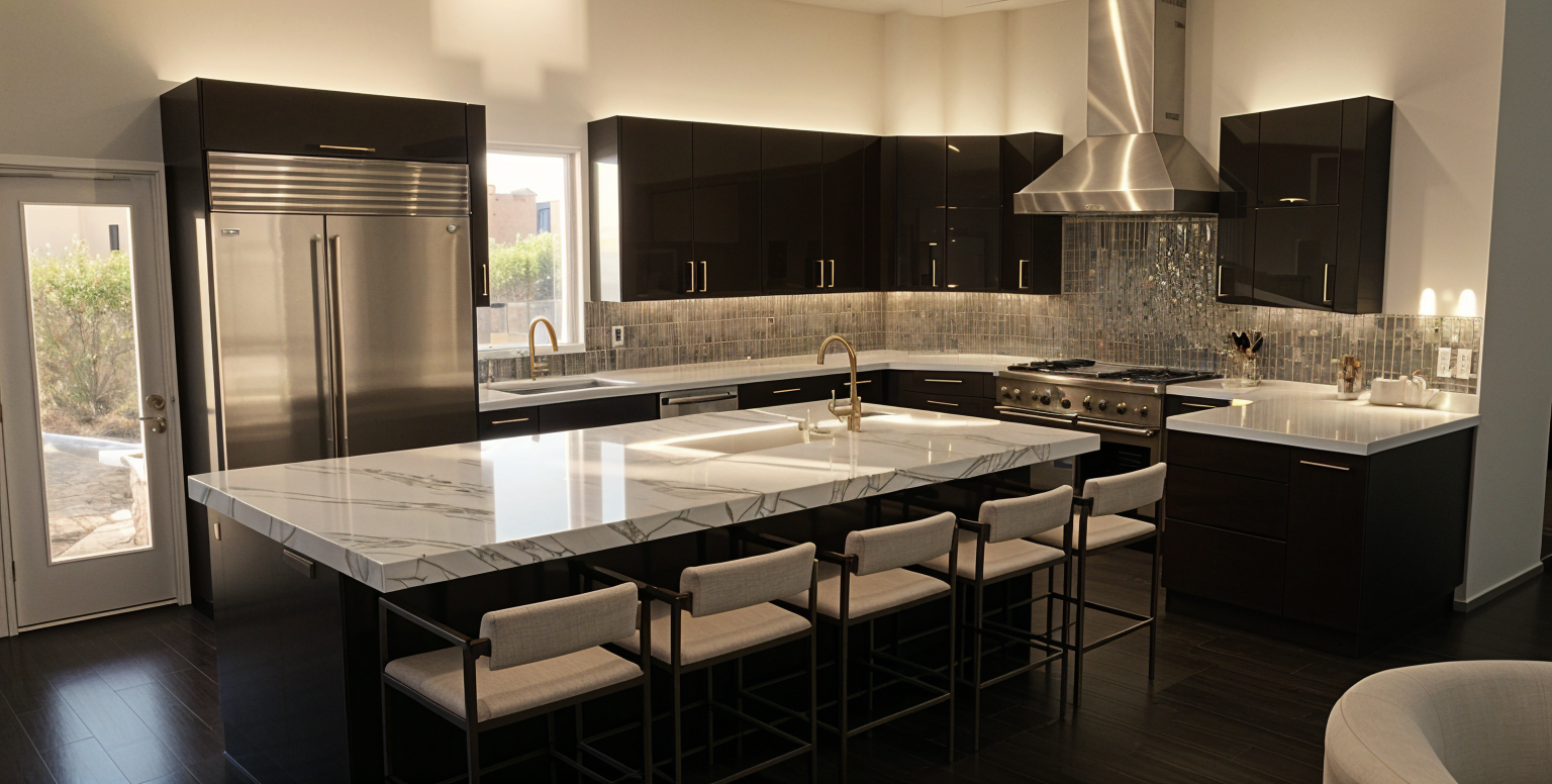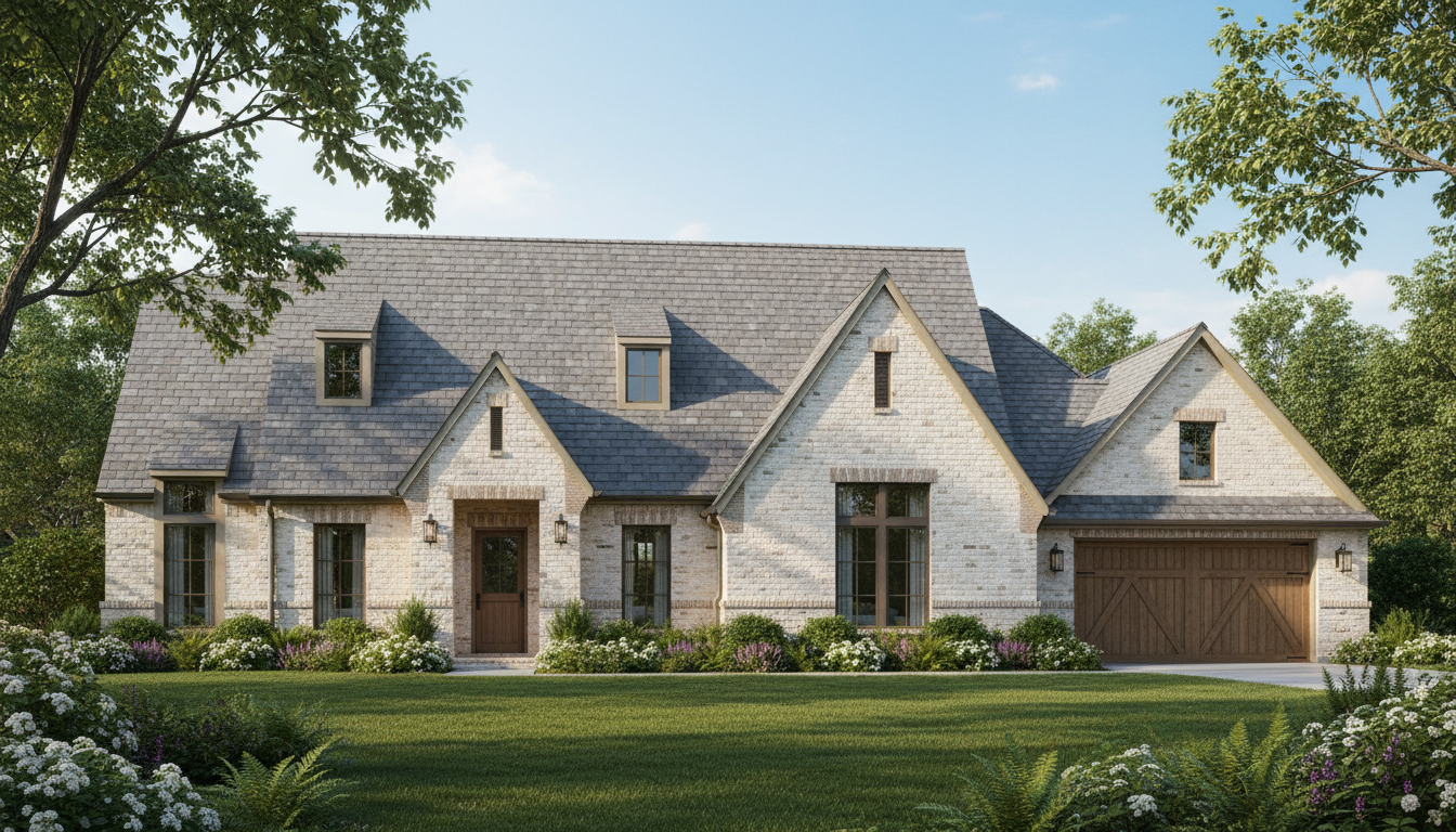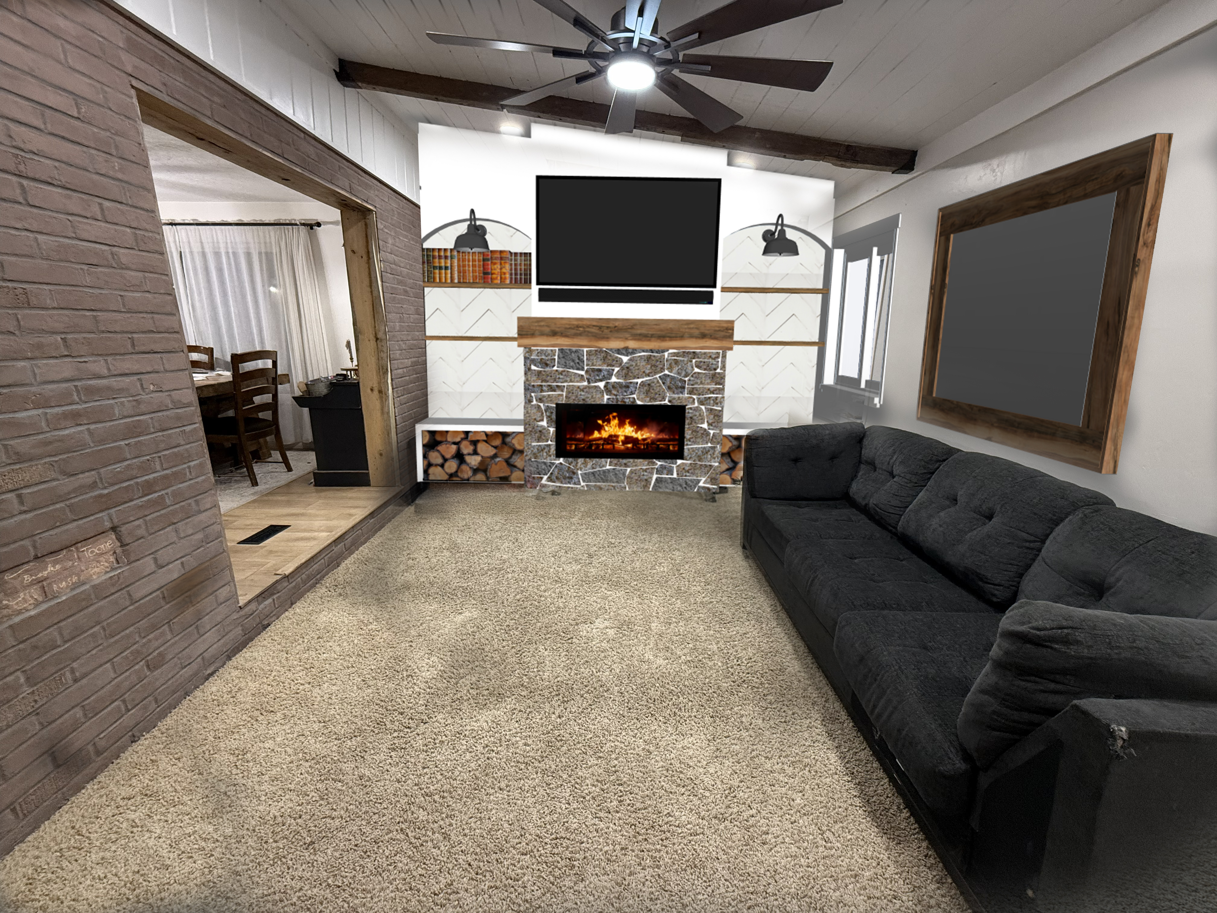 render a cozy living room with a warm atmosphere the room features an elegant stone fireplace with a glowing fire complemented by a wooden mantle the walls are painted in a soft white with rustic brown brick accents the ceiling is white with dark wooden beams and a modern black ceiling fan hangs above a large dark gray plush sofa rests on a beige carpet facing the fireplace adjacent to the fireplace is a stack of neatly arranged firewood on the left a dining area is partially visible featuring wooden chairs and light flowing curtains that add softness the room should feel inviting and warm with soft ambient lighting highlighting the textures of the materials