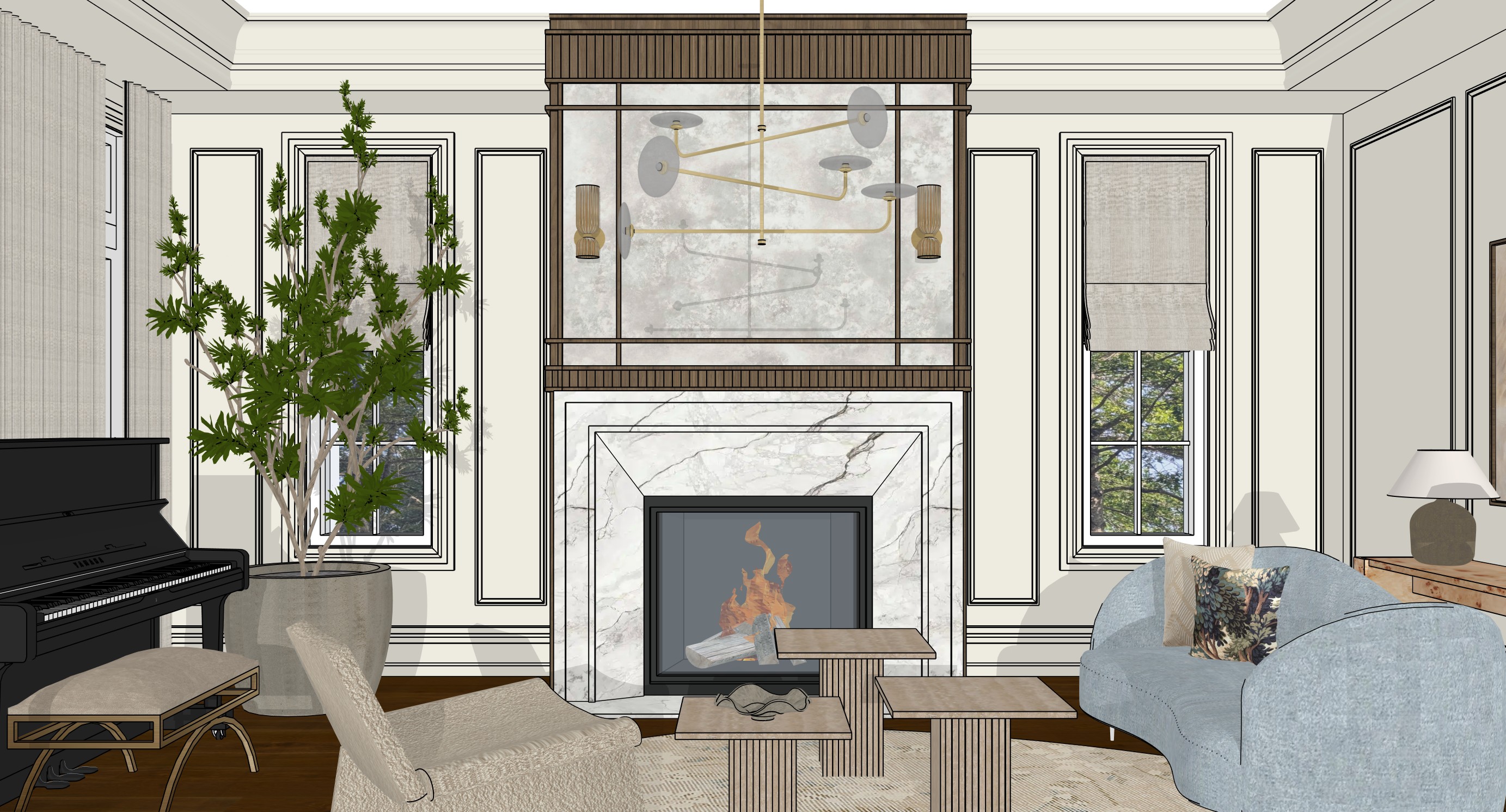 photorealistic render of the provided sketchup interior model important strictly match the 3d model exactly do not redesign restyle reinterpret or add remove any objects do not add decorative elements that are not present in the model preserve exact geometry proportions scale placement and material definitions scene requirements fireplace box natural look crackling fire with black reflective glass lining fireplace mantel the fireplace is framed with a white marble surround composed of multiple stepped layers not a single flat slab exactly as shown in the image fireplace surround and overmantel the areas of vertical wood detailing is fluted not slatted this means the surface is one continuous solid wood panel vertical grooves are carved into the wood concave channels no gaps no separation no individual pieces the profile is smooth and rounded not rectangular the flutes are evenly spaced and run continuously do not interpret as slats battens or separate strips do not introduce gaps or shadow lines between pieces this is carved fluted millwork not applied slats antique mirror panels above fireplace flat slightly distressed antique mirror panels do not add any additional mirror frames or decorative mirrors wall sconces cylindrical ribbed glass sconces mounted symmetrically on the mirror panel omitting a soft warm glow of light chandelier modern sculptural chandelier with brushed arms and flat glass circular discs omitting a soft warm glow of light maintain exact arm angles and proportions walls cream color with precise panel molding layout as modeled do not simplify or redesign moldings ceiling cream color bulkhead cream color crown moulding cream color do not simplify or redesign window casing cream color do not change detail from what is shown in the image baseboard cream color do not change detail from what is shown in the image two windows beside the fireplace off white roman shades at the exact height and fold style shown windows behind piano sheer off white linen ripple fold drapery mounted as close to ceiling as possible on a brushed brass rod no additional window coverings added exactly as shown furniture left black upright piano and bench minimal reflection correct proportions bench frame is in a brushed brass and the seat is in an griege colour linen fabric center three travertine nesting tables with ribbed vertical bases and sharp rectangular tops left foreground off white boucle armchair with exact silhouette right curved pastel blue velvet sofa with low back and rounded form matching proportions exactly console table behind sofa burl wood console table plant next to the piano a tall indoor plant with thin branches and clustered leaves in a rounded planter do not add any additional plants in the room rug soft wood rug with faint pattern materials use realistic pbr materials but match the exact color roughness and scale from the model do not upscale materials into more luxurious or stylized versions lighting use neutral natural daylight slightly golden negative constraints no added decor no redesignno extra mirrors no change in chandelier design no change in molding profiles no stylization no reinterpretation