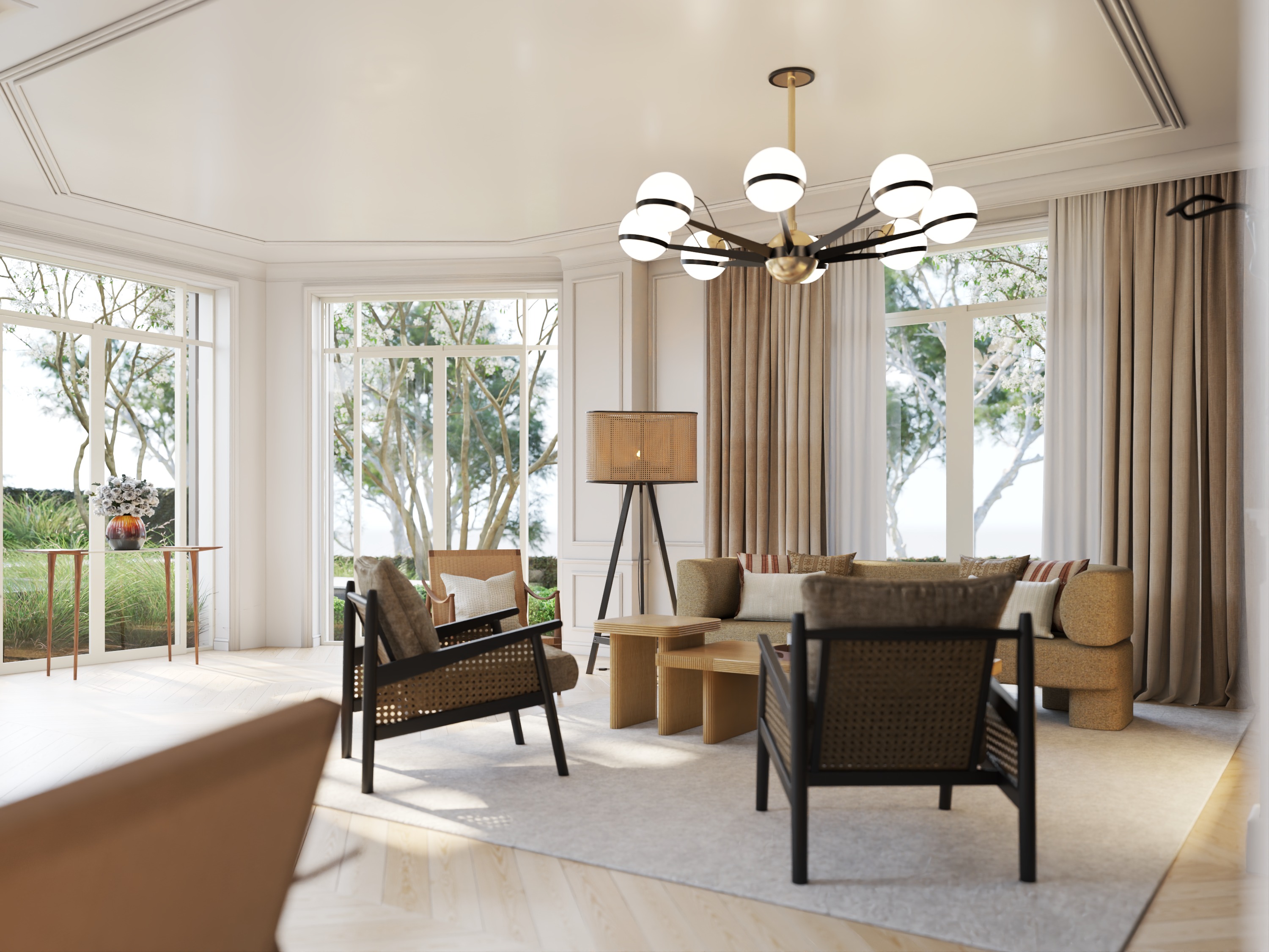 enhance the realistic texture and evening lighting maintain the elements material and angle of the picture maintain the shape of outdoor vegetation set the outdoor indirect lighting in every tree outside the room