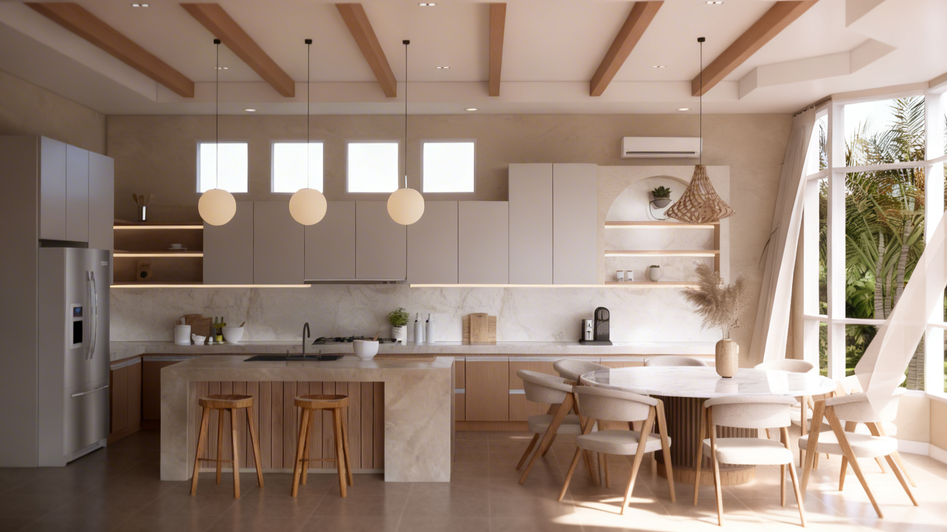 render this kitchen with light grey upper cabinets and dark grey base cabinets shaker style cabinet doors brass bar pull handles brass sink faucets stainless steel appliances walnut flooring a grey quartz countertop and grey backsplash subway tile installed in a brick pattern the island wall facing outward should be sheetrock and painted white the walls in the apartment should all be painted white the doors should be 2 panel shaker doors painted white base molding should be painted white hide the mats in front of the island close the soffit above the kitchen