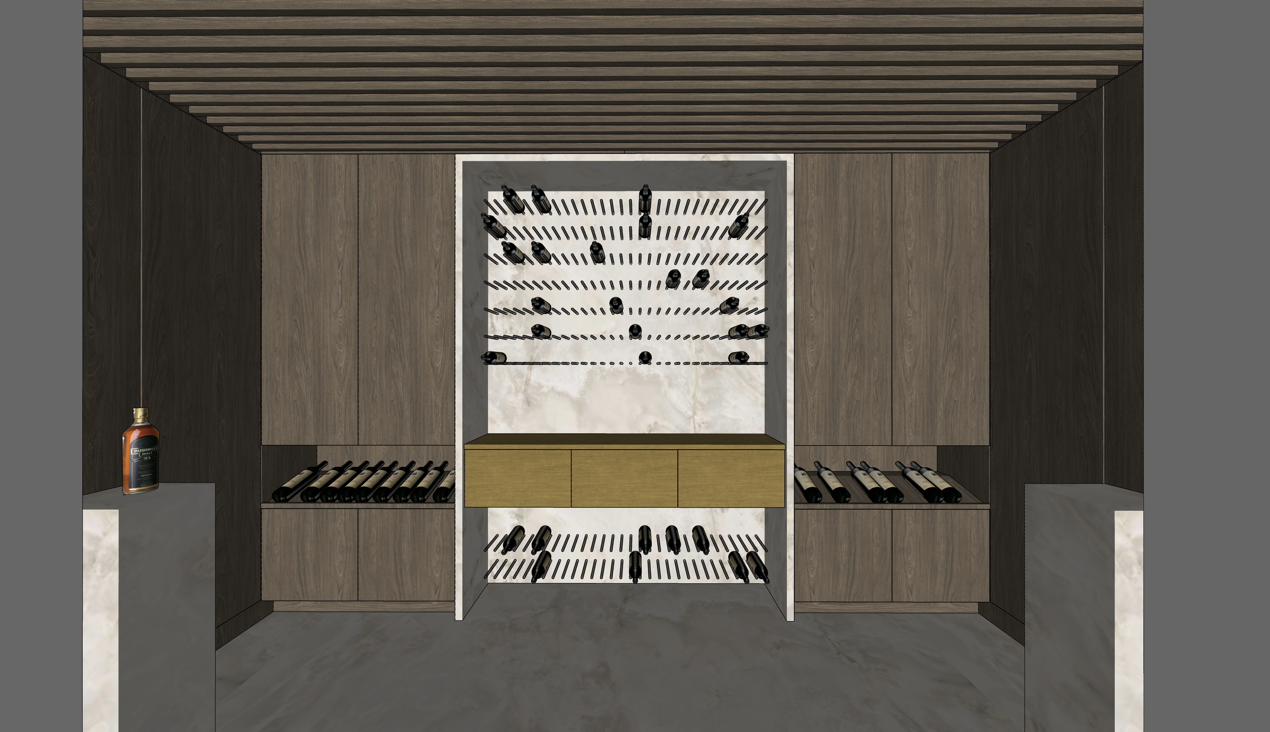 render a luxurious wine cellar with dark oak wood walls and ceiling incorporate a marble countertop with a light gray veined pattern display wine bottles artfully within open shelves using a mix of deep green and amber glass for the bottles highlight the center with a brass accent cabinet reflecting warm ambient lighting the floor should have a onyx stone texture with a warm beige tone ambient lighting should create a cozy sophisticated atmosphere with subtle shadows for depth