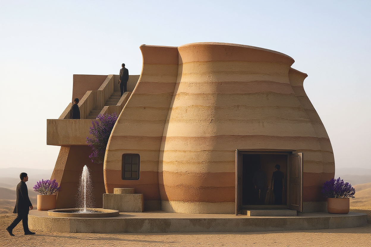 exterior shot of a modern building in a desert landscape fully surrounded by a fence rammed earth facade with warm richer deeper red orange and sandy beige horizontal strata rammed earth texture rammed earth bridge color palette locked to warm red rammed earth hues only no alternate colors the bridge must use the same red rammed earth gradient exactly include only two openings 1 a curved steel front door that follows the exact curvature of the rammed earth wall the door must not be straightened flattened modified or altered in shape it must fit perfectly within the curved opening with no geometric reinterpretation weight 1 0 2 one rectangular window no additional windows or doors place a small fountain centered directly beneath the left window no people soft daylight with slight haze desaturated earthy tones cinematic and minimalist composition muted colors and flat entourage silhouettes that blend graphically reduce hyper real reflections and glossiness add subtle film grain for a calm atmospheric conceptual architectural visualization with editorial quality features a pathway leading up to the building