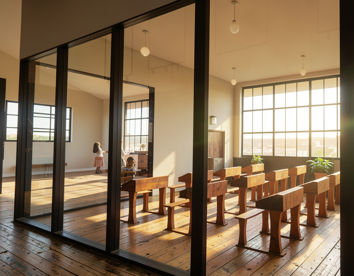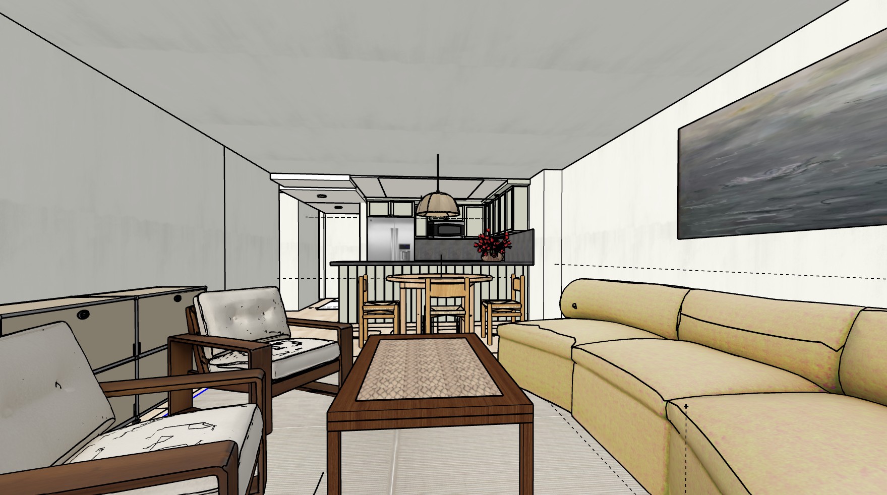 modern minimalist open plan living room and kitchen scandinavian inspired design with a calm elegant editorial interior style soft neutral palette with warm beige tones and diffused natural daylight two mid century armchairs upholstered in long haired cream mohair curly sheepskin paired with a low profile modular sofa in pastel mustard yellow fabric rectangular wooden coffee table featuring inset square ceramic tiles on the tabletop subtle artisanal detail cabinetry behind chairs in tan lacquer with chrome accents round wooden dining table with simple chairs positioned between living area and kitchen kitchen cabinetry in a muted subtle pastel blue green tone paired with a charcoal stone countertop and matching backsplash creating a refined contrast stainless steel appliances integrated cleanly large abstract painting on the wall minimal styling with a small floral arrangement central pendant lantern softly illuminated casting a warm ambient glow and enhancing the serene atmosphere natural materials clean lines uncluttered composition soft shadows global illumination photorealistic architectural visualization wide angle lens eye level perspective high end editorial quality