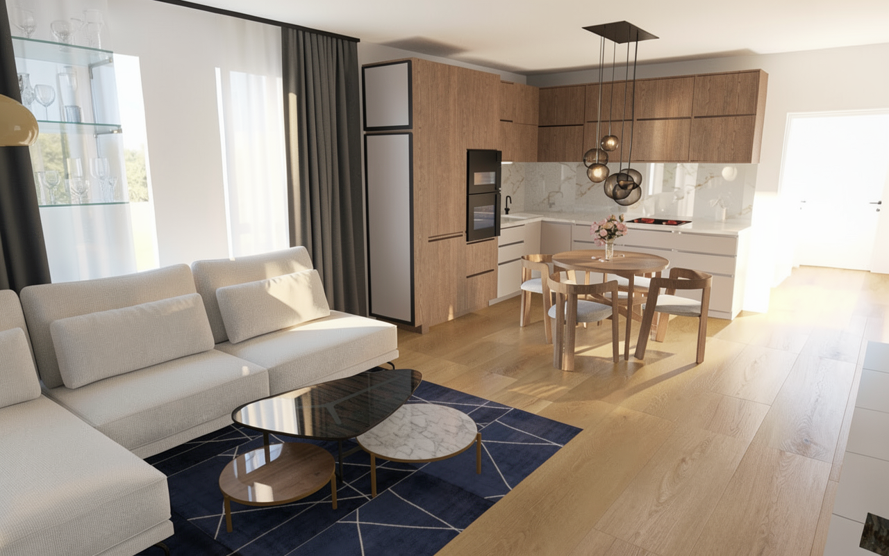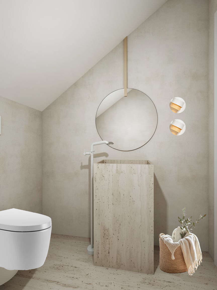 realistic high resolution render the wall has a light beige cemento effect there is a circular mirror slightly larger in scale enhancing the sense of space above it a thin vertical wooden slat extends from the top of the mirror up to the ceiling adding a subtle architectural detail the overall atmosphere is calm minimal and refined with natural materials and a clean architectural aesthetic the celling is white the only light sources are the sconces which are white and rattan lights the celling is white