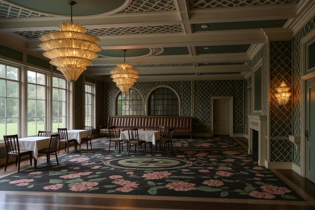 make this a photorealistic rendering of actual buildings in late afternoon light with lights on the buildings make the white box a modern steel and glass building with second floor patio