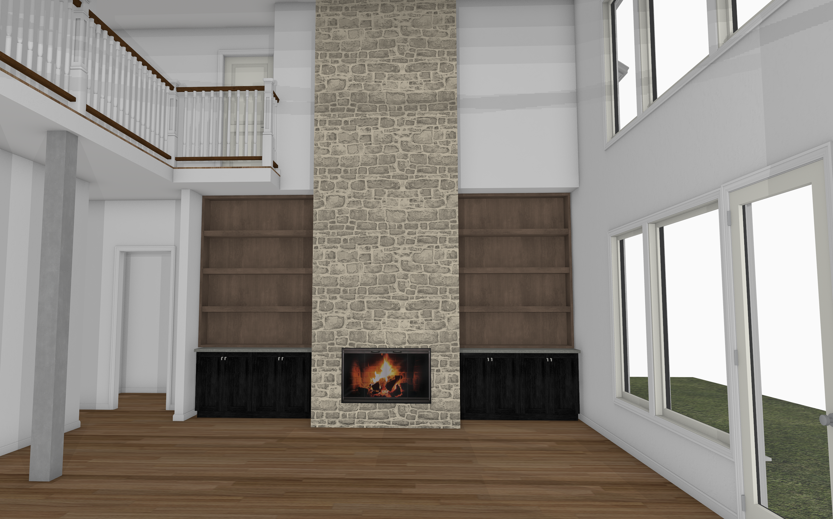 maintain all geometry create a hyper realistic interior rendering in the morning this is a first floor room the windows are overlooking a marsh sunset add a tv over the fireplace that has a picture frame around it the frame is brass