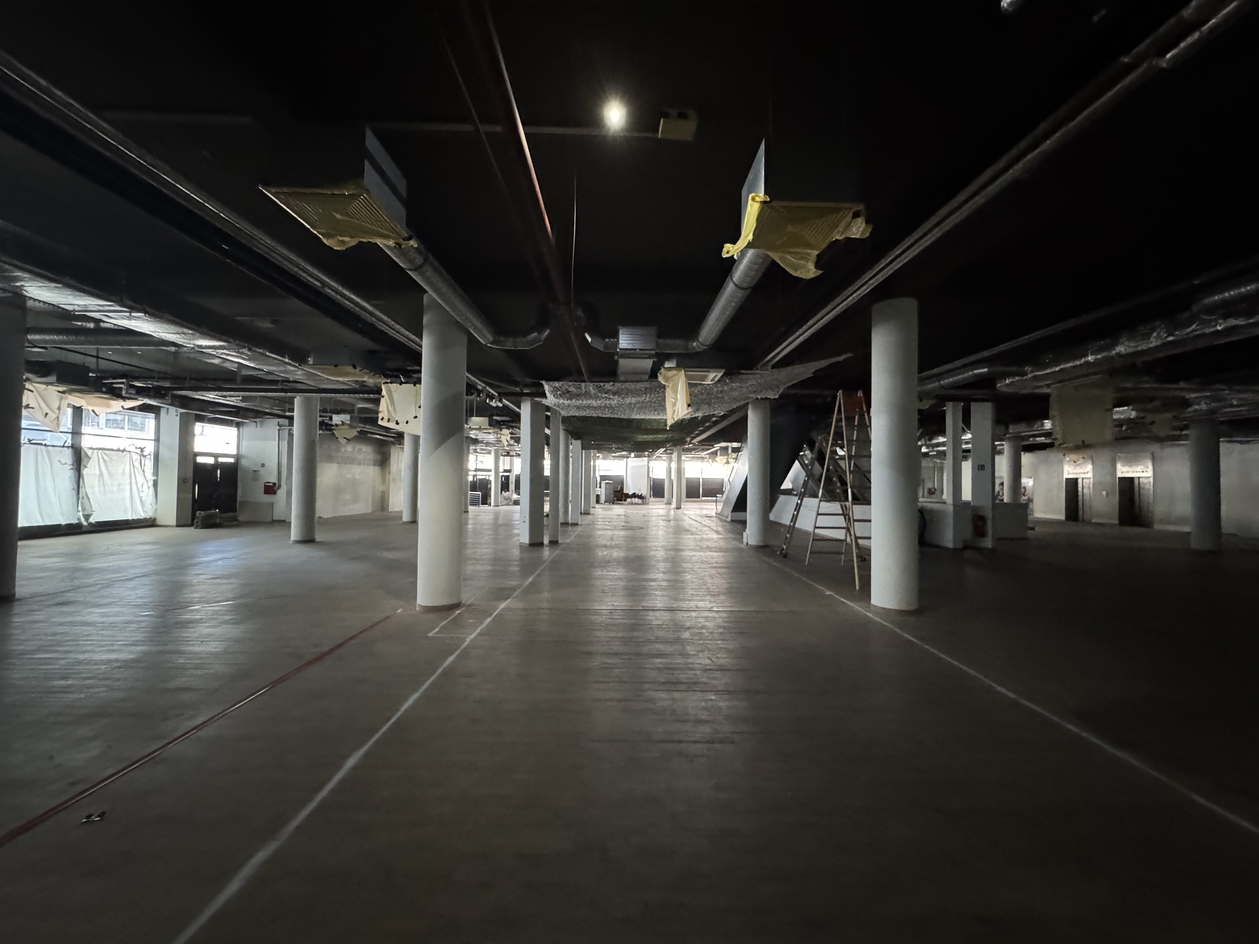 the passage is only the width of the white posts and nothing wider or narrower create a high quality cozy and modern overall image this is the passage of a shopping arcade design high quality shops on the left and right of the posts the passage is indicated by the white lines optionally also add a coffee cart make this passage appear lively