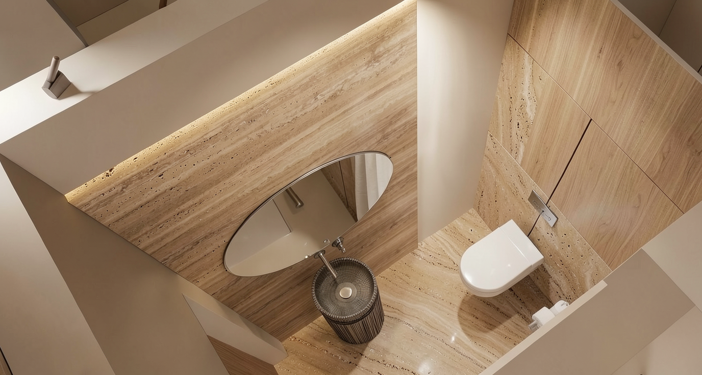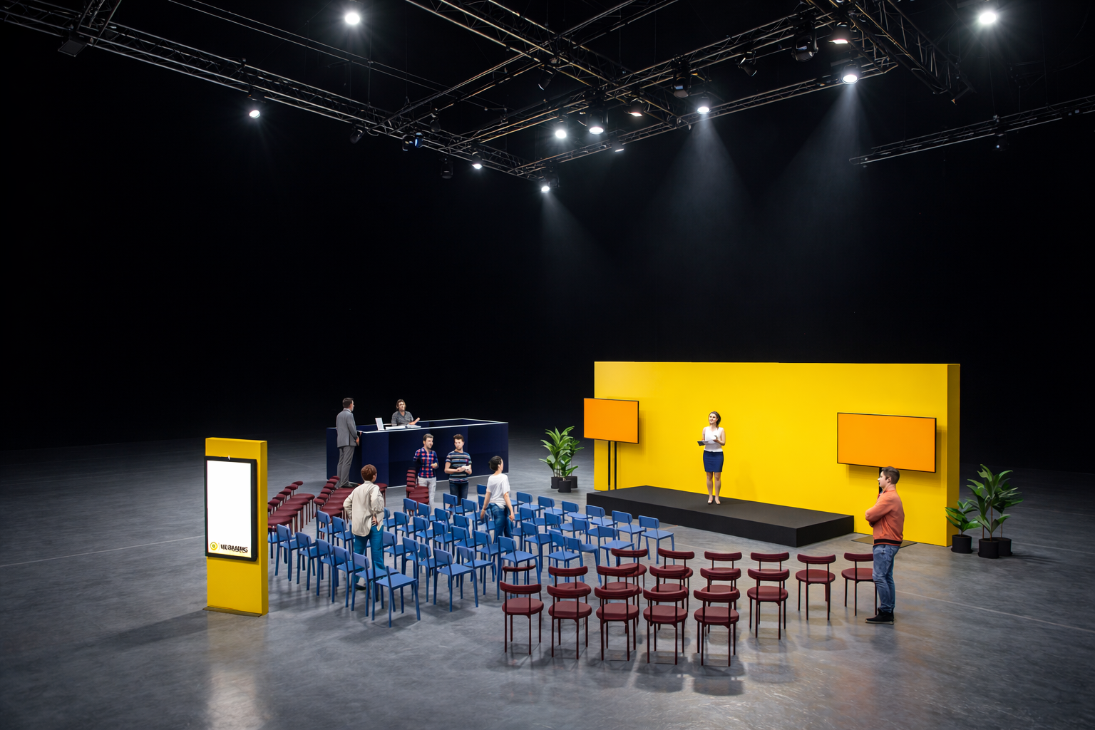 create a modern conference hall scene with an emphasis on minimalism and vibrant colours the atmosphere should be professional and inviting the walls are a bright yellow with two matching screens a presenter stands on a black stage dressed in a white top and blakc pants chairs are arranged in an orderly fashion alternating between deep blue and burgundy a dark blue sound desk on the left with people interacting professionally two green potted plants add a touch of nature the lighting is crisp and focused highlighting key areas the setting feels dynamic and ready for an informative event exterior walls are to be draped with black curtains within the large space the lighting should be very dark with light focusing on the stage
