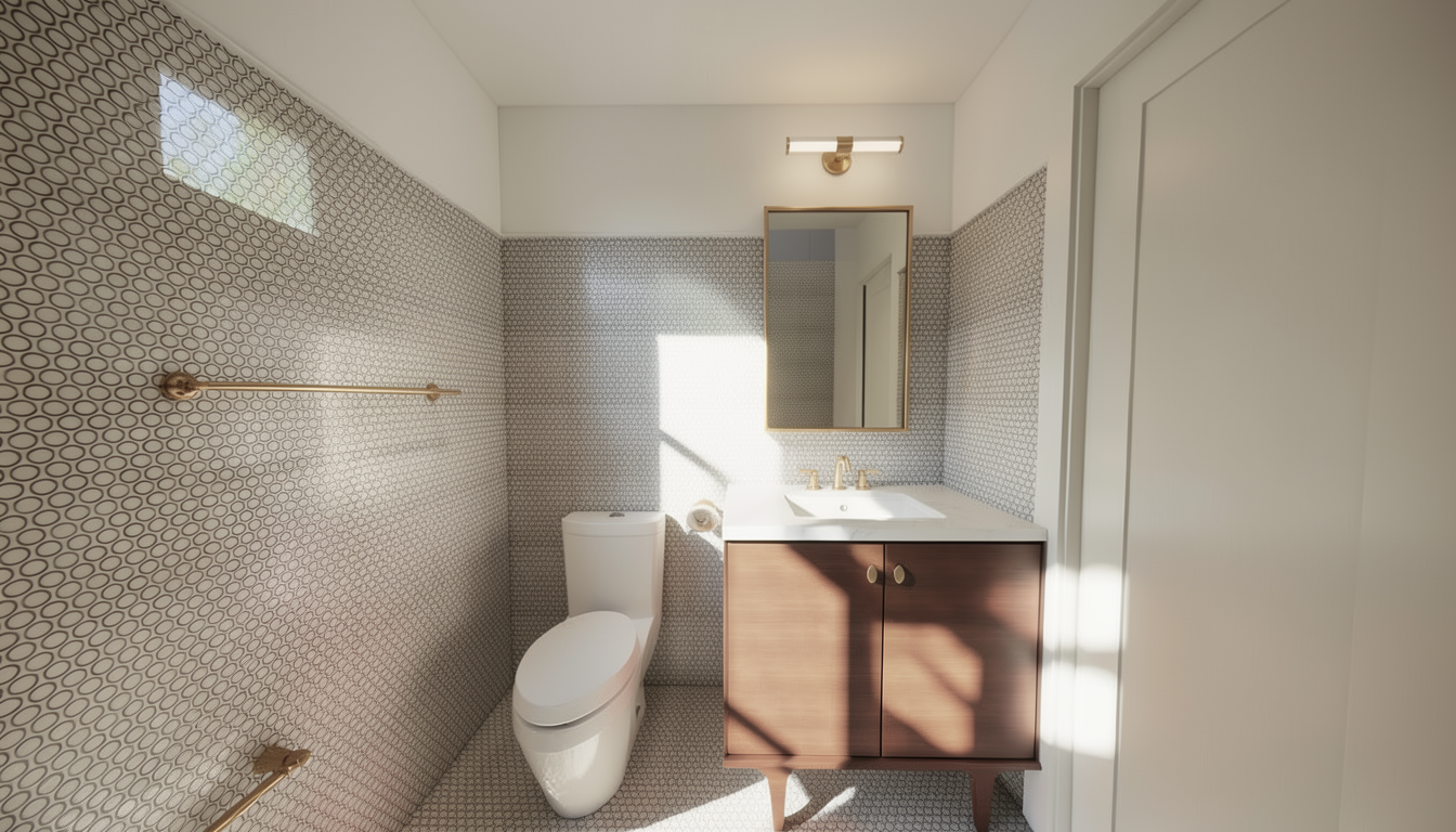 create an hdri photo realistic rendering from my image do not change any image details do not move or modify features keep the colors the same make the rendering photo realistic with 4k resolution add natural sunlight as if there is a small window from across the vanity there should only be sunlight streaming across the floor and on the lower half of the vanity only no sunlight on walls