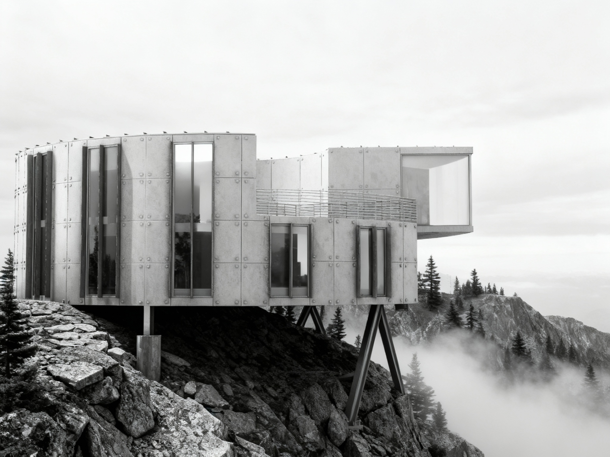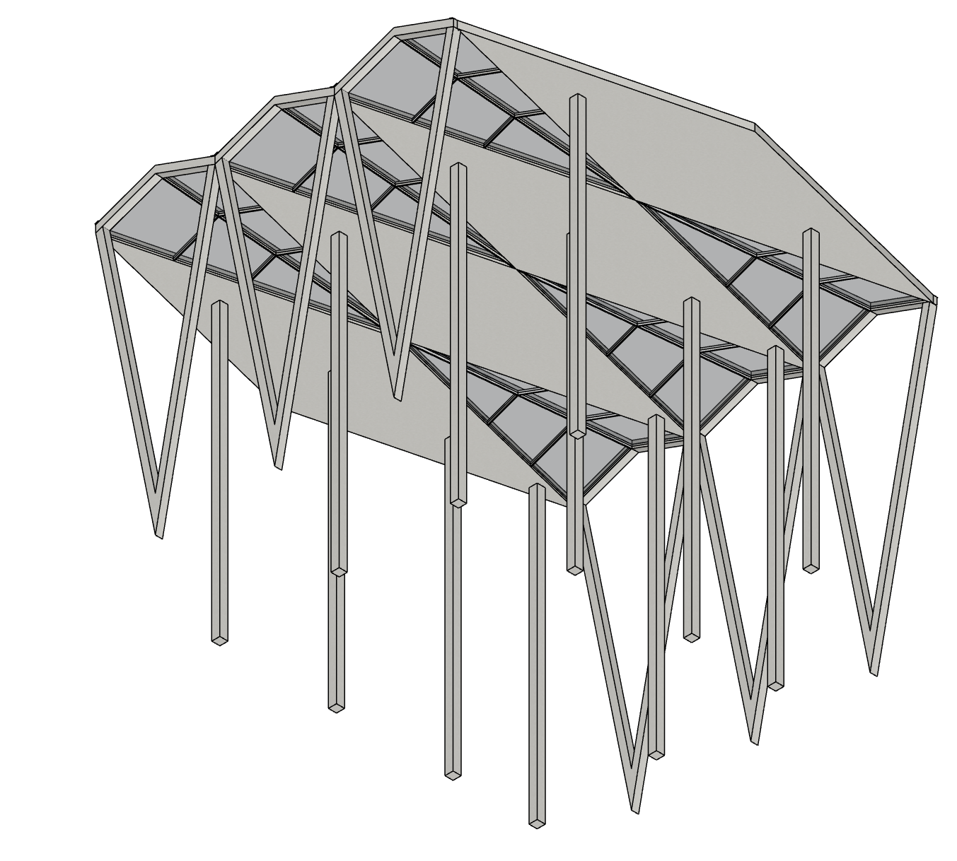 create a close up detail view of the pavilion underside preserve the exact geometry but zoom into one roof bay and its supports clearly show the clerestory glazing underside beams mullion intersections and how both the straight column and v shaped leg connect to the roof using light seat plates or brackets use the same material palette pale concrete