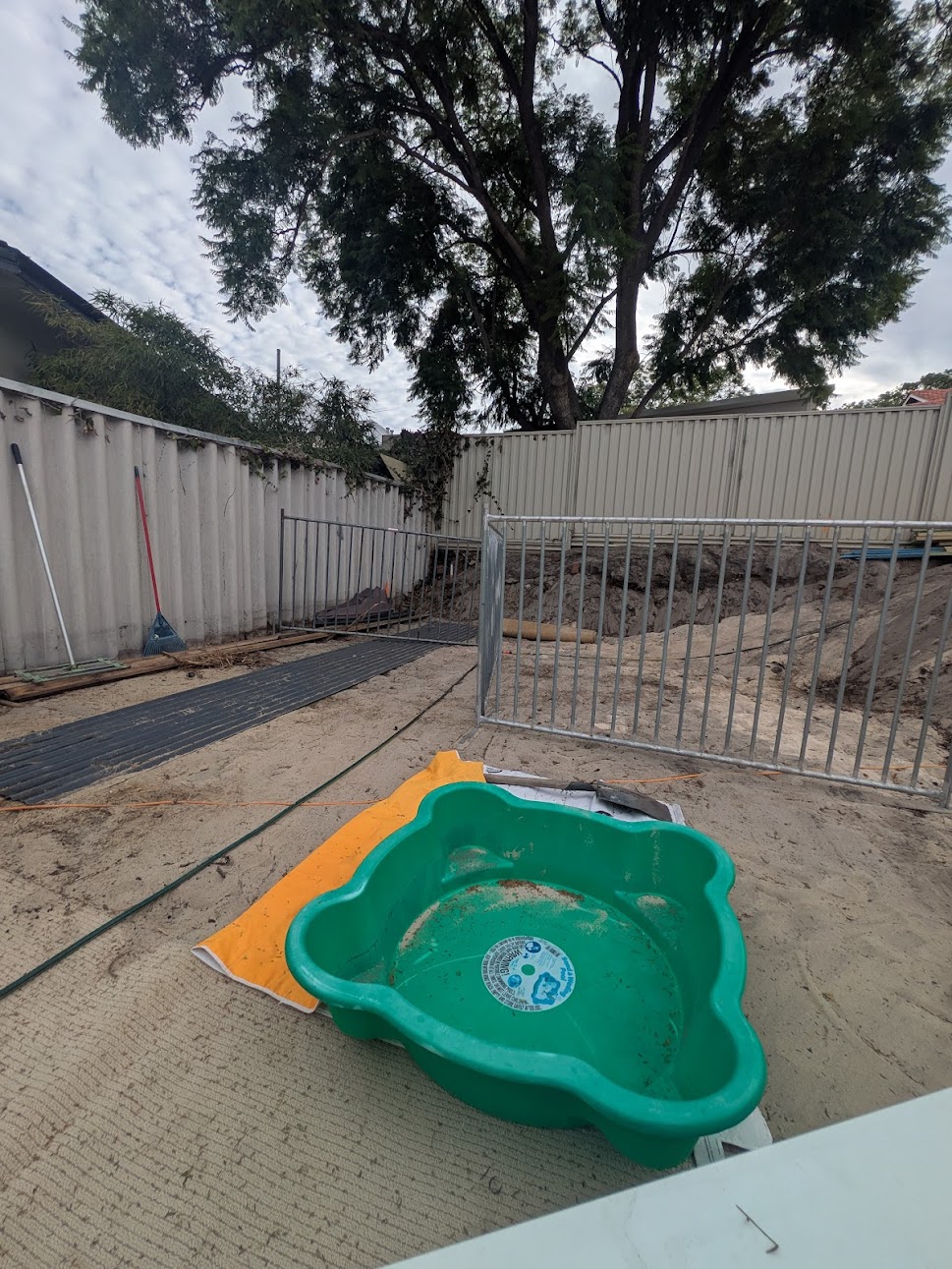 paint the fences white allow for established bay trees to the left side fence grass to fill all areas the rear fench has toodyay stone boulders and succulents growing through racking up the sand pile with two established crepe myrtle trees remove the fencing add more sunlight