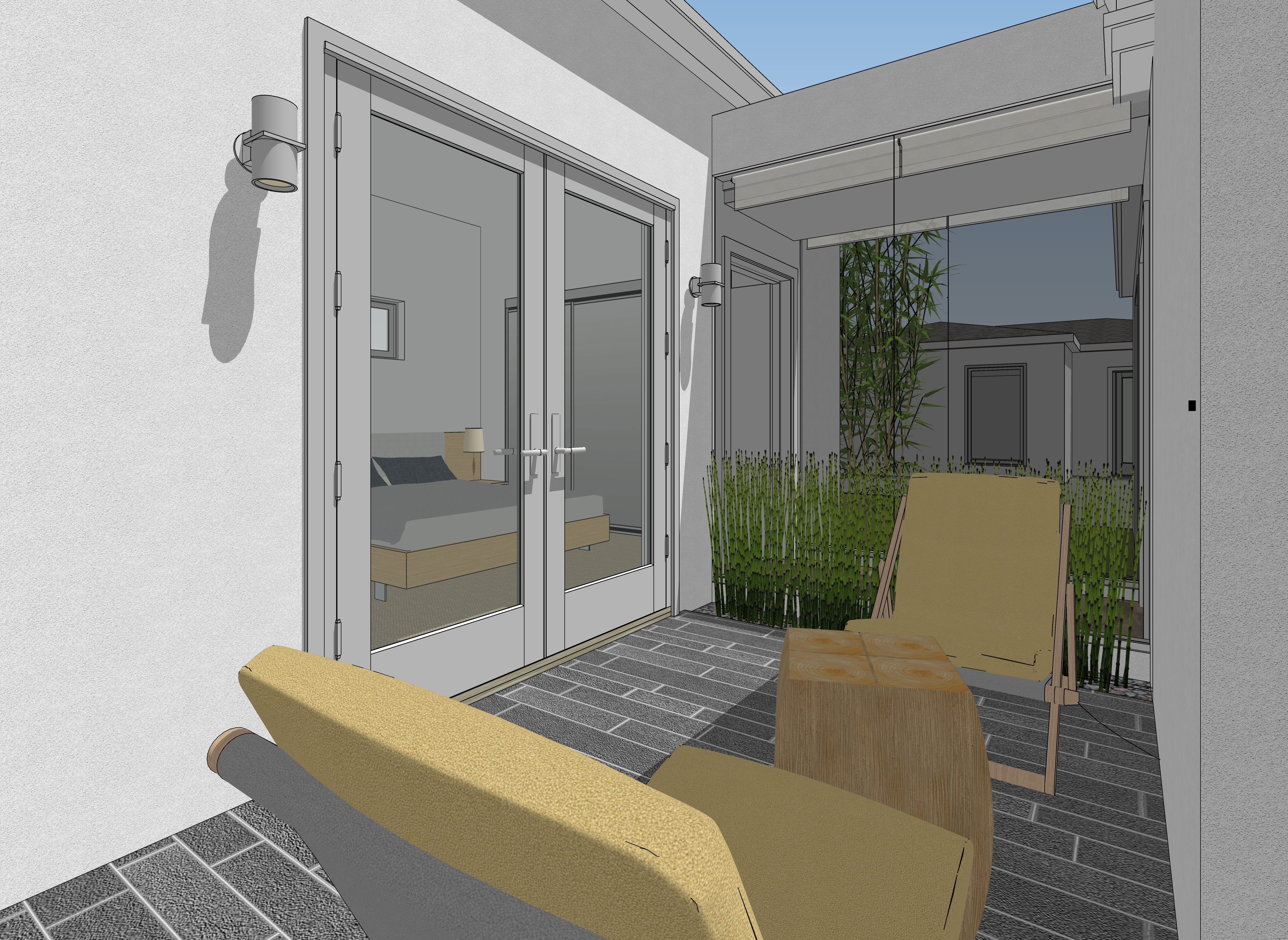 add a man walking in the glass corridor between the two buildings add a potted flowering plant at the lower left corner of the view add two coffee cups on the table the doors light fixtures and window frames are made of silver matte anodized aluminum