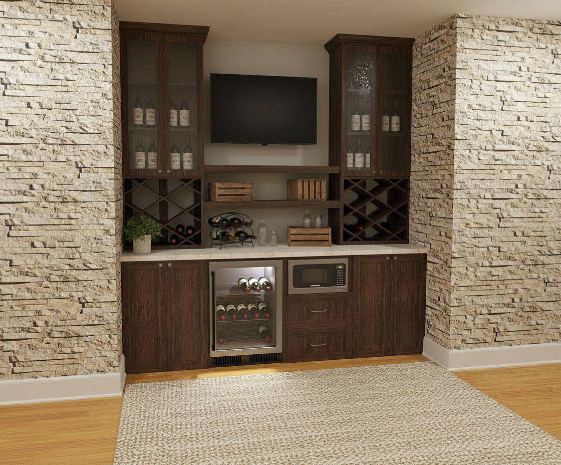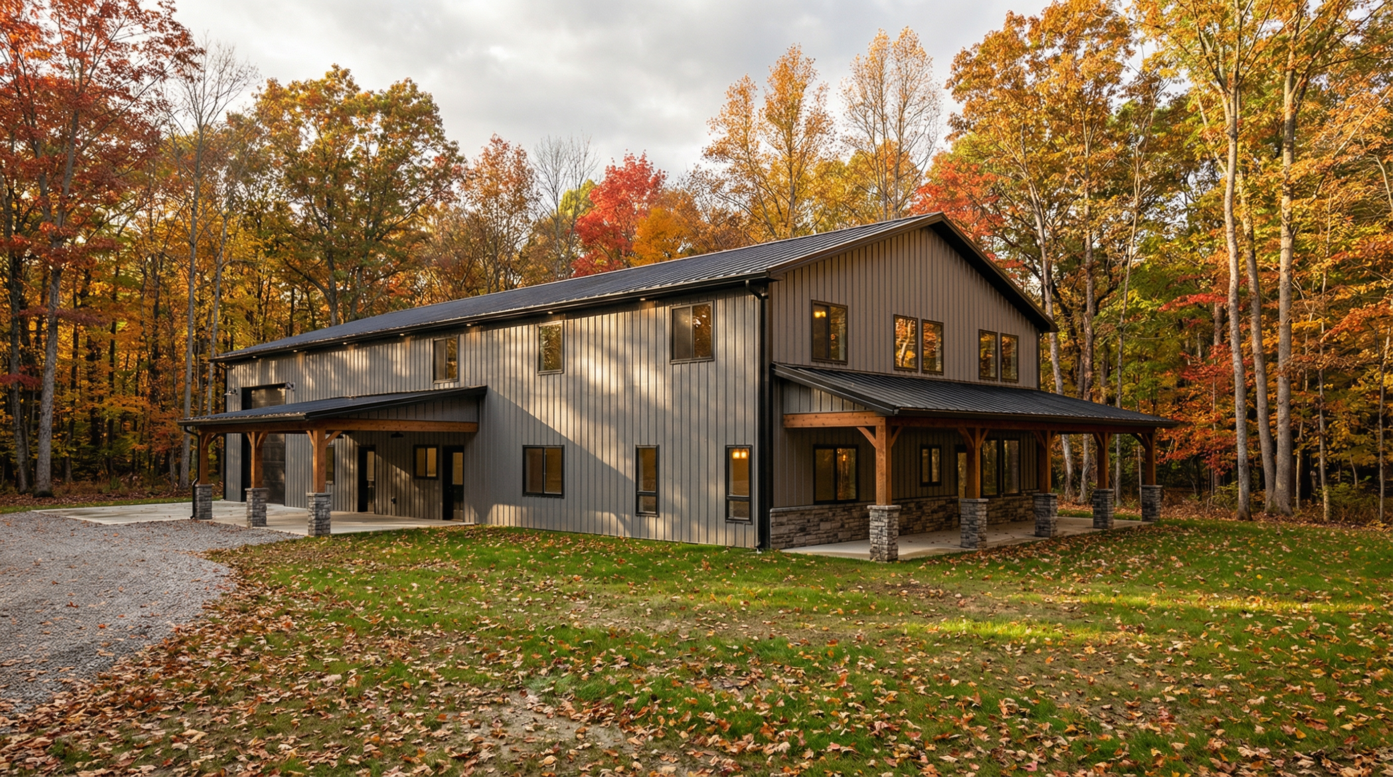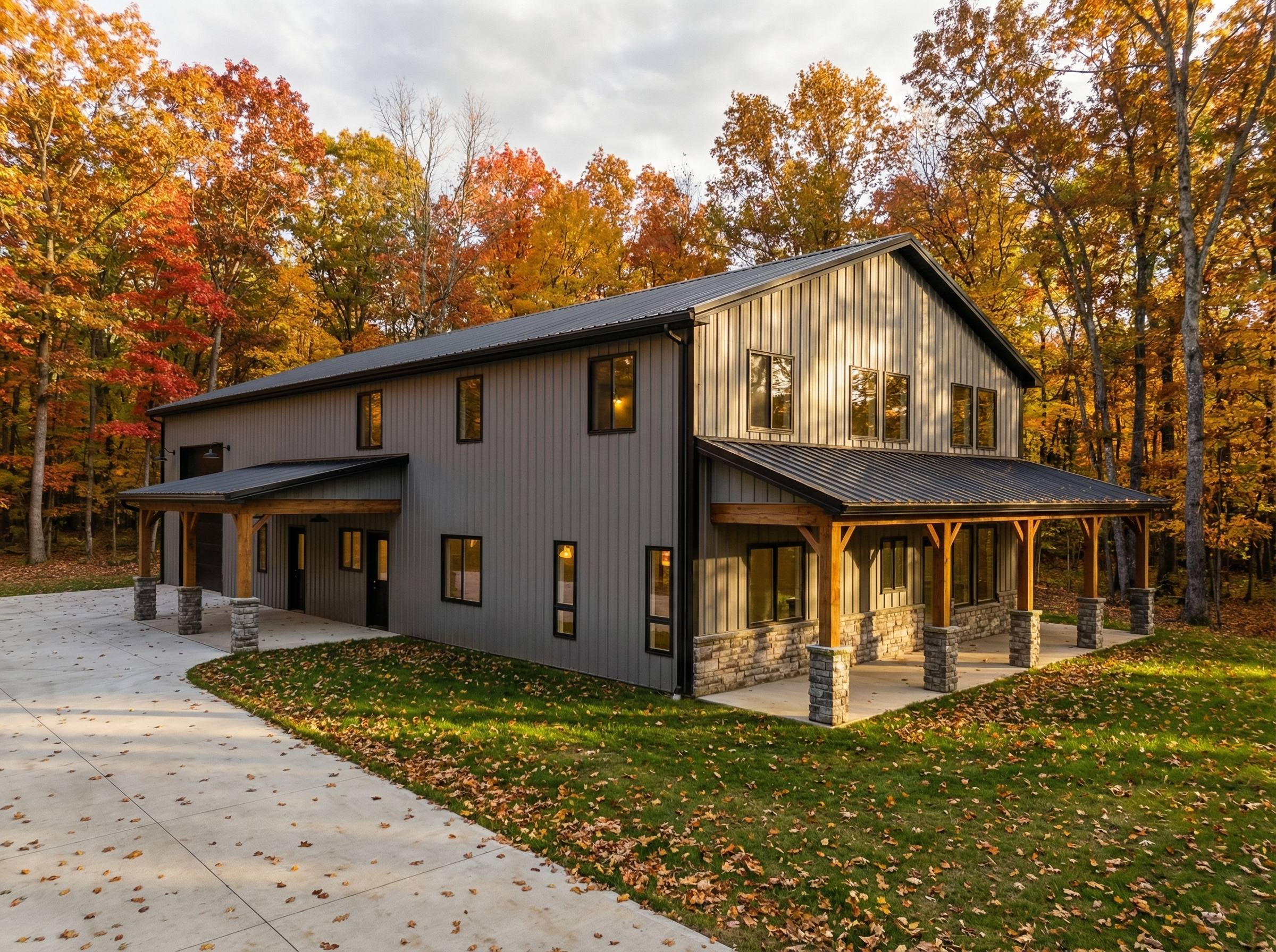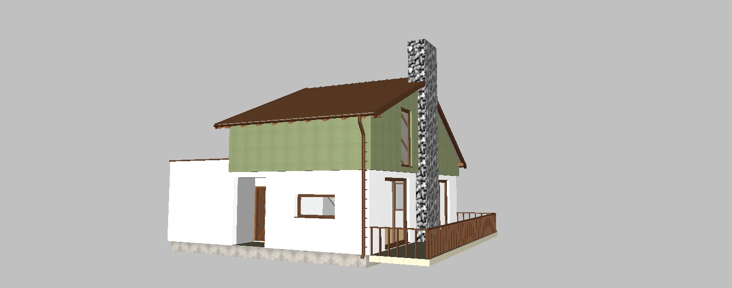 ultra realistic architectural exterior visualization of a small residential house photographed at eye level the upper floor is finished with vertically installed wooden facade cladding in olive green color with natural wood grain subtle imperfections and realistic weathering the lower floor is covered with smooth white plaster clean and minimal the roof is made of chocolate brown trapezoidal metal sheets with fine ribbing realistic reflections and soft highlights gutters downspouts and window sills are all in matching chocolate brown metal finish pvc windows and doors are chocolate brown matte with realistic glass reflections and depth the terrace fence is constructed from brown wooden boards evenly spaced varnished with a semi gloss finish visible wood texture and natural color variation the chimney is clad in natural river stone with irregular shapes high resolution stone texture realistic joints and depth flat terrain with subtle grass and soil variation forested background with dense green trees natural depth of field slightly blurred distant vegetation soft natural daylight overcast sky for diffused lighting physically accurate shadows global illumination ambient occlusion hyper realistic materials pbr textures cinematic realism 4k quality professional architectural photography style no people no vehicles no text