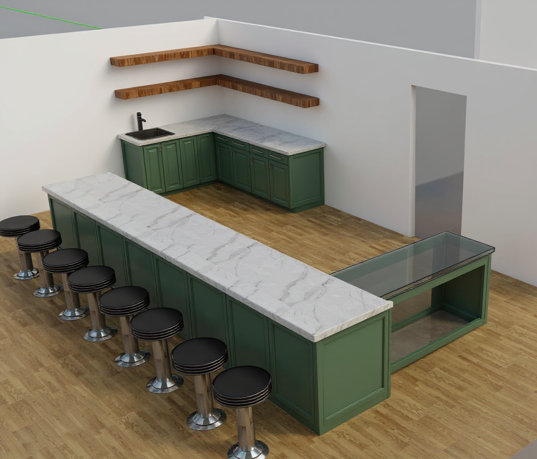 the part of the cabinet with a glass front also has a glass countertop make sure they are glass the other countertops are white marble with grey veins mainain colors there is no waterfall element to the marble countertops it is green cabinet to match on the sides of the long cabinet use the green color as shown in my original concept drawing make the cabinets an grey green duskier match the color of dunn edwards bijoux green de6266 but more grey and duskier even more grey like army green make the color lighter and less vibrant and add more grey to the green make the floating shelves light walnut