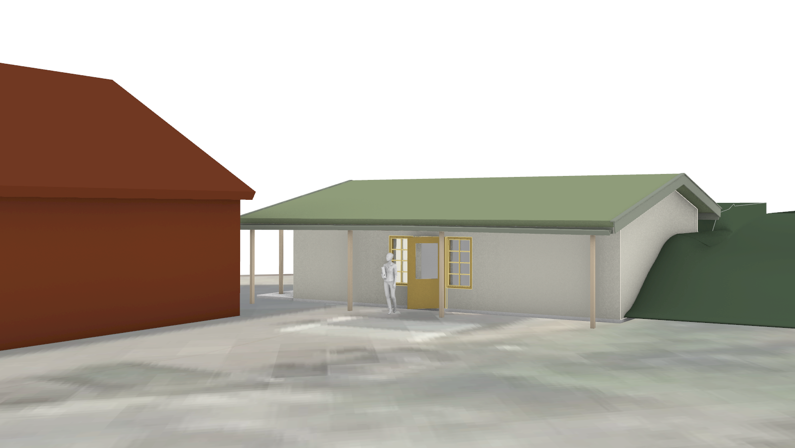 the small house on the right should have a plastered facade in a light sand color and a plant roof that looks like a meadow the barn on the left should have a fulur d standing panel the green wavy line on the right of the small house is a smaller mountain the mountain is a swedish west coast granite and about twice as high as the house quite flat but reaches far ahead make the ground look like gravel and make the woman look lika a apple farmer even the white ground should be gravel the windows and the door should be more like the original in ockra yellow