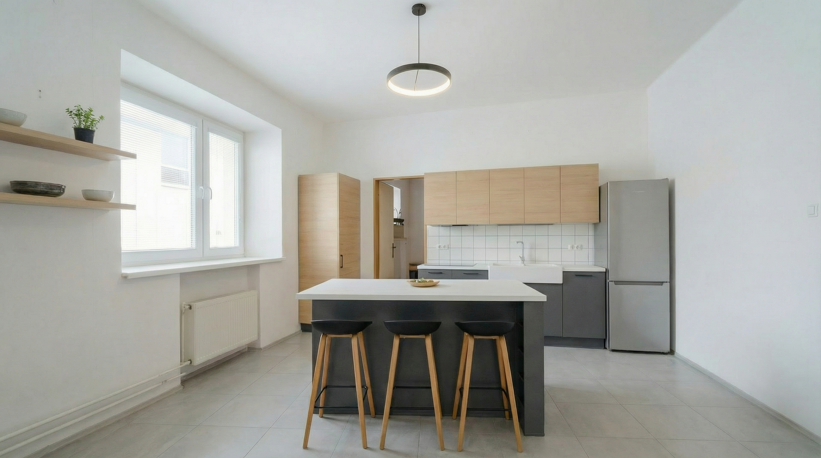 interior shot upravit perspektivu fotografie tak aby byla sc na vyrovnan a nato en kolmo k div kovi srovnat horizont ln i vertik ln perspektivu interi ru zejm na kuchy skou linku ostr vek sk ky a lednici tak aby linie byly rovn a rovnob n s okraji sn mku odstranit m rn pooto en sc ny doleva a dorovnat pohled na eln symetrick z b r zachovat realistick proporce m tko a vzhled interi ru nem nit design barvy ani materi ly dn stylizace pouze technick korekce perspektivy a rotace