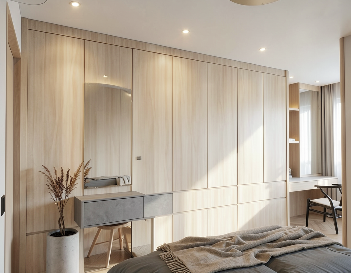 preserve all existing textures geometry materials colors and proportions overall scene is evenly brightened using neutral 3500k lighting only do not add highlights glow reflections or new light sources lighting comes only from the vanity light with white semi transparent scones 3500k and mirror backlighting the mirror on the right wall has a soft white backlit halo 3500k evenly diffused there is no sunlight nor any light source other than the vanity light and backlit mirror the shower head and all shower fixtures are not light sources and emit no light mirror has a white semi transparent glass edge all metal hardware and accessories are brushed brass the door on the left is not a light source and does not reflect any lighting the back wall and the right side wall are unicolor with heavy 3d horizontal rough chiseled texture