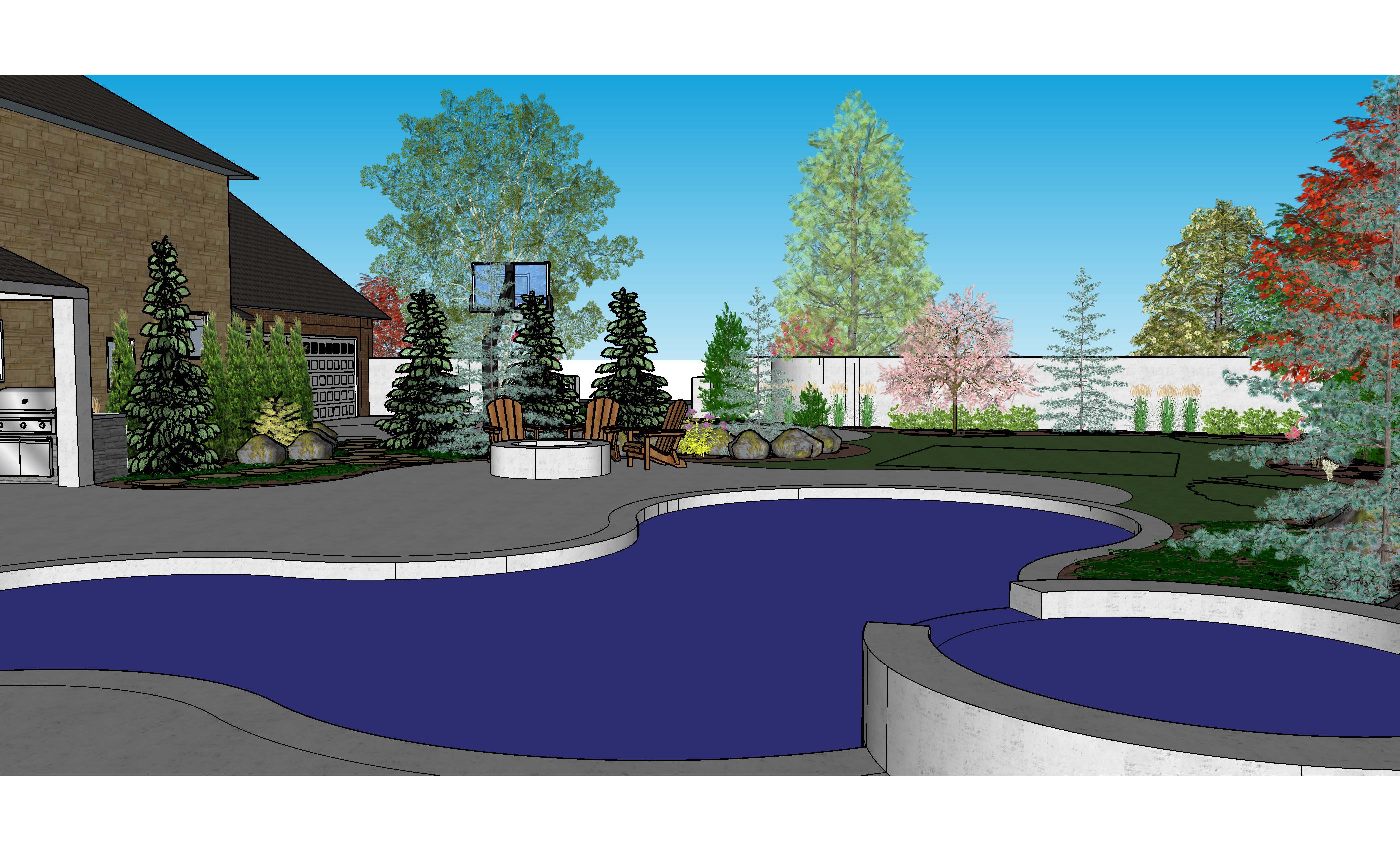 the exterior fence walls are dark red brick there is a gap between the 2 big trees where the driveway is to the street the concrete patio is antico quoqina concrete finish the spa and firepit have the same stone as the house do not put a square in the grass area that is marked for future