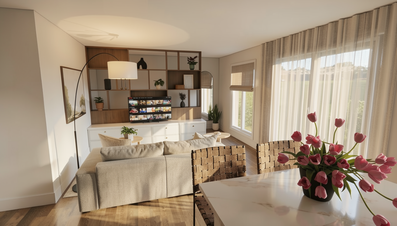 enhanced interior lighting wine display in case to the right white stone texture on walls
