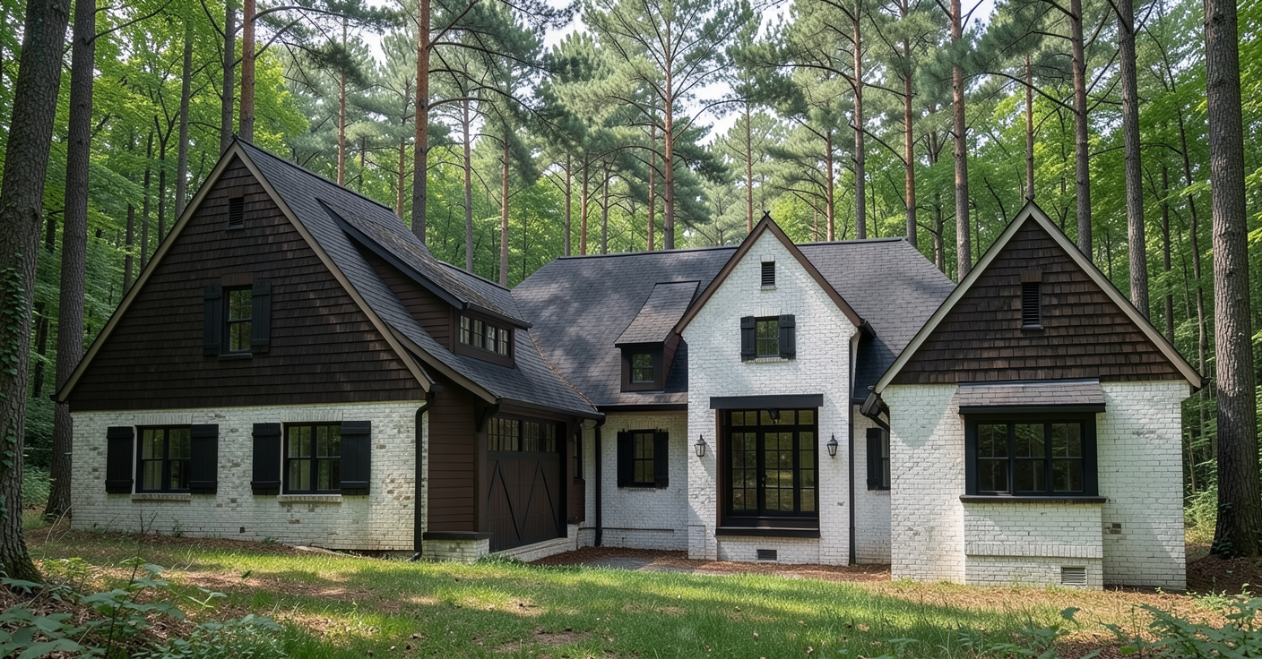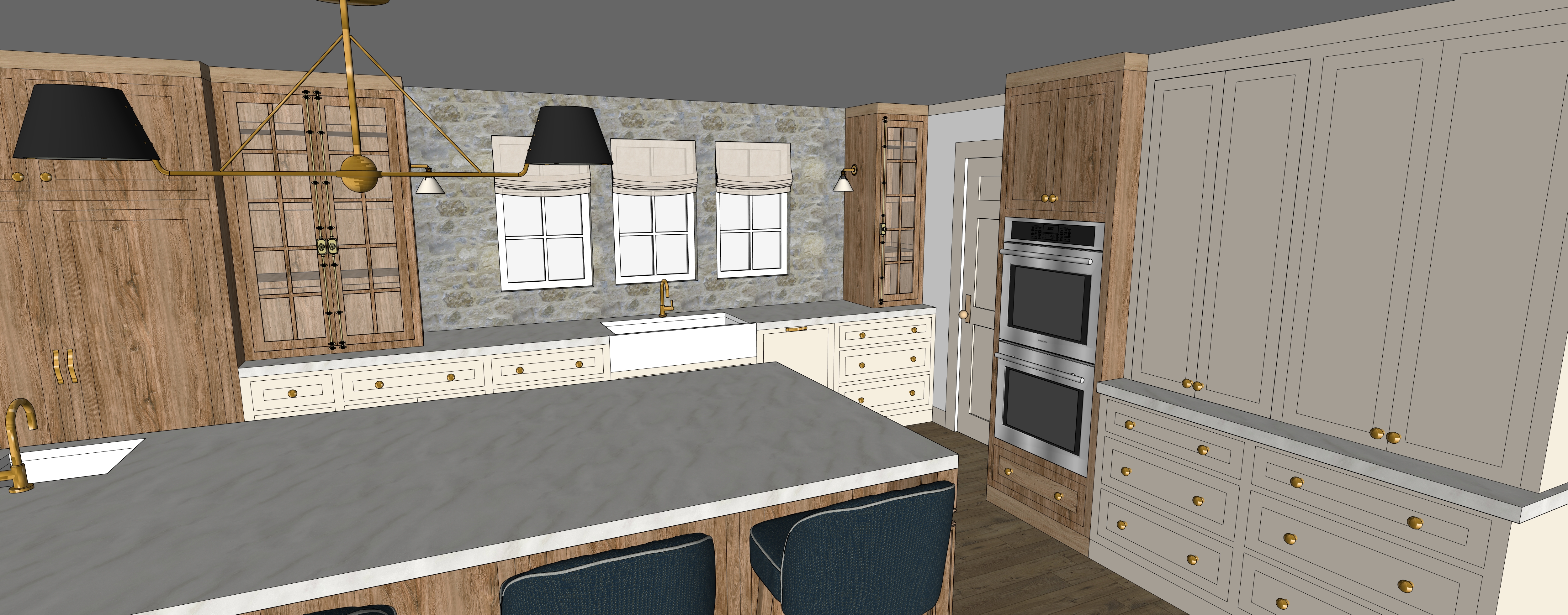 create a highly photorealistic rendering of a traditional kitchen from an angled view across the island toward the sink and range wall use the provided image as a fixed architectural model do not alter layout cabinetry lighting placement or camera perspective this is a materials and lighting refinement only no redesign overall mood warm layered and refined slightly moody but still bright enough to read finishes clearly editorial quality interior photography materials perimeter cabinetry primary fix soft off white warm beige paint matte finish no sheen add subtle tonal variation between doors and drawer fronts increase shadow depth in panel profiles and reveals current issue too flat and uniform wood cabinetry tall glass cabinets warm natural oak stronger grain visibility with tonal variation slight aging no orange tone no flat tan matte finish island same wood tone as perimeter wood but slightly richer add shadowing at leg joints and panel edges increase depth at toe and underside countertops honed marble soft gray base with warm undertones subtle veining not high contrast matte finish no shine slight edge softness stone backsplash wall major fix limestone or plastered stone look tones warm gray taupe soft beige reduce contrast significantly blend tones avoid patchy dark spotting add depth through soft shadow in joints subtle surface irregularity current issue too busy too contrasty reads fake window treatments soft linen roman shades warm off white gentle folds with soft shadowing hardware fixtures aged brass muted patina no shine or mirror reflection barstools deep blue green fabric matte woven texture visible weave slight tonal variation wood legs warm and natural lighting most important adjustment natural light soft daylight from windows diffused no direct sun beams slight brightness near windows gently fading inward interior lighting pendant lights very soft glow only no bright bulbs or hotspots shades remain mostly dark sconces subtle warm accent light no bright halos shadow depth corrections add contact shadows under island under cabinets behind faucet stool legs to floor introduce gentle shadow gradient across island surface deeper shadow under countertop overhang soft darkening toward corners of the room color temperature 3000 3500k warm neutral balanced not yellow not cool realism boosters add ambient occlusion cabinet seams panel edges where materials meet introduce micro variation wood tone shifts slight paint variation subtle imperfections add light falloff slightly darker foreground brighter midground window wall camera output maintain current angle eye level 5 ft 28 35mm lens high dynamic range 4k 8k resolution rendering style professional architectural photography soft contrast not flat materials feel tactile and real no glossy or artificial surfaces