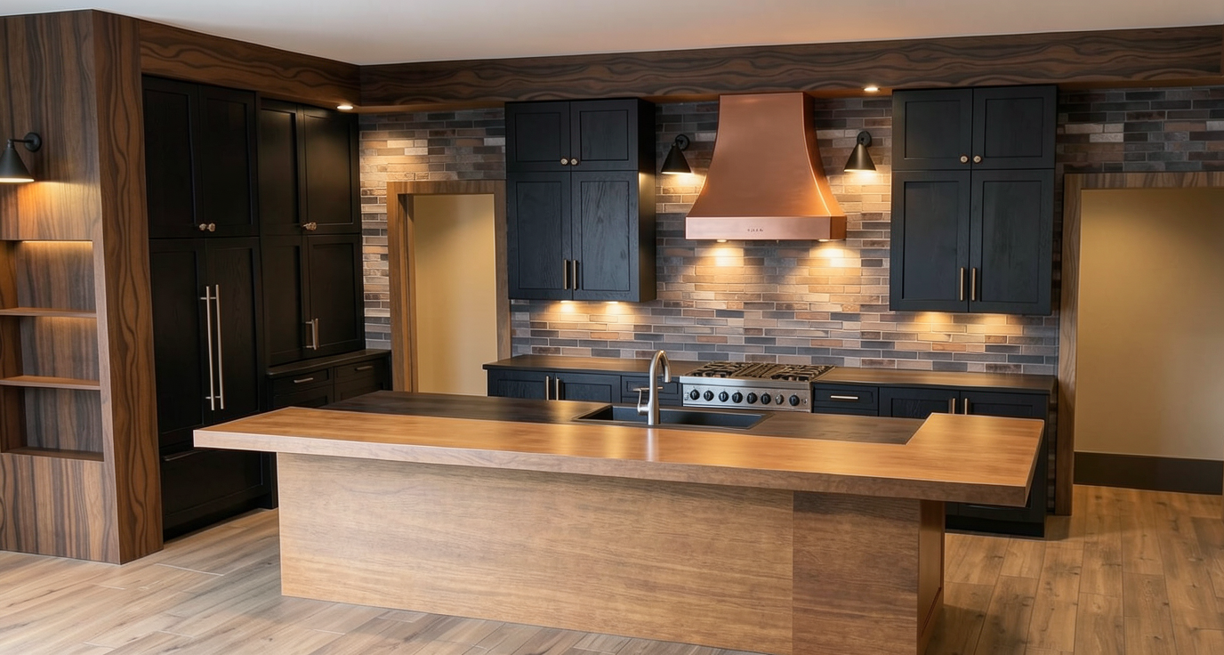 the hood is a brushed copper metal with a soft natural patina maintain its exact tone and shape the island is a medium caramel wood tone with visible grain keep the warmth and depth consistent all perimeter cabinets are a deep black stained wood with visible wood grain the grain must clearly show through not painted not flat black maintain the contrast between the dark perimeter cabinets and the warm toned island important the full perimeter cabinetry must be completely visible in the render do not crop obscure or truncate any perimeter cabinets show all runs of cabinetry clearly and in full doorways important both side doorways should lead into small adjacent rooms not blank or exterior space these rooms should feel cohesive with the kitchen by using coordinating warm earthy tones no bright white or stark contrast pull colors from the kitchen palette warm wood tones soft browns muted neutrals so the transition feels natural and intentional keep lighting in these rooms soft and warm slightly dimmer than the kitchen for depth lighting all sconces must have visible downward facing light downlighting casting a warm glow onto the backsplash lighting should be warm and realistic enhancing materials without washing out color additional instructions show all perimeter cabinetry clearly with no cropping or shadow obstruction keep backsplash flooring trim and architectural details exactly as shown maintain a high end real life rendering style not overly stylized or dramatic preserve hardware finishes and placement make the space brighter and the sconces have a downlight do not turn island into stone do not remove wood grain do not flatten cabinet color to pure black do not crop cabinetry do not overexpose lighting do not simplify materials