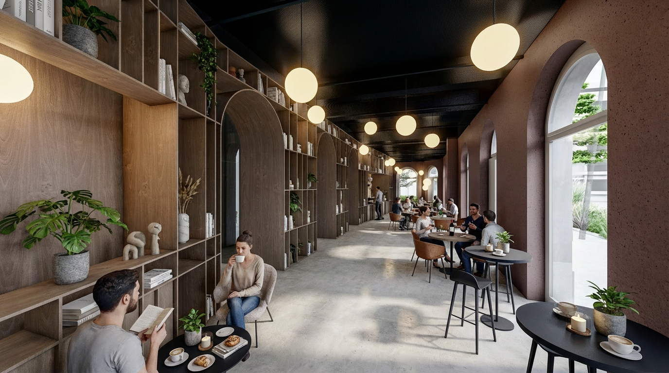 place decoration on the tables and the shelf place people to the chairs drinking coffee and wine place curtains