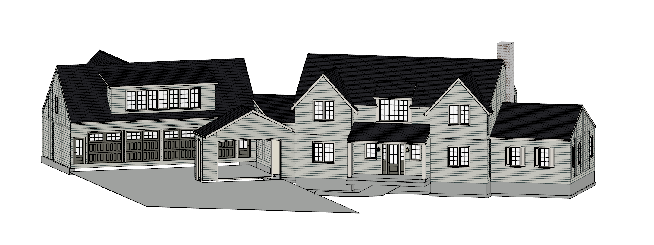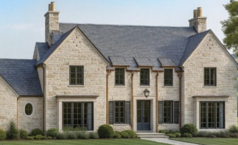 exterior shot exterior shot photorealistic rendering of a modern tudor style home and 4 car garage with tan stone black windows charcoal colored roof oak wood front door oak wood timber corbels keep the size layout scale and structure place in a wooded setting with lots of trees