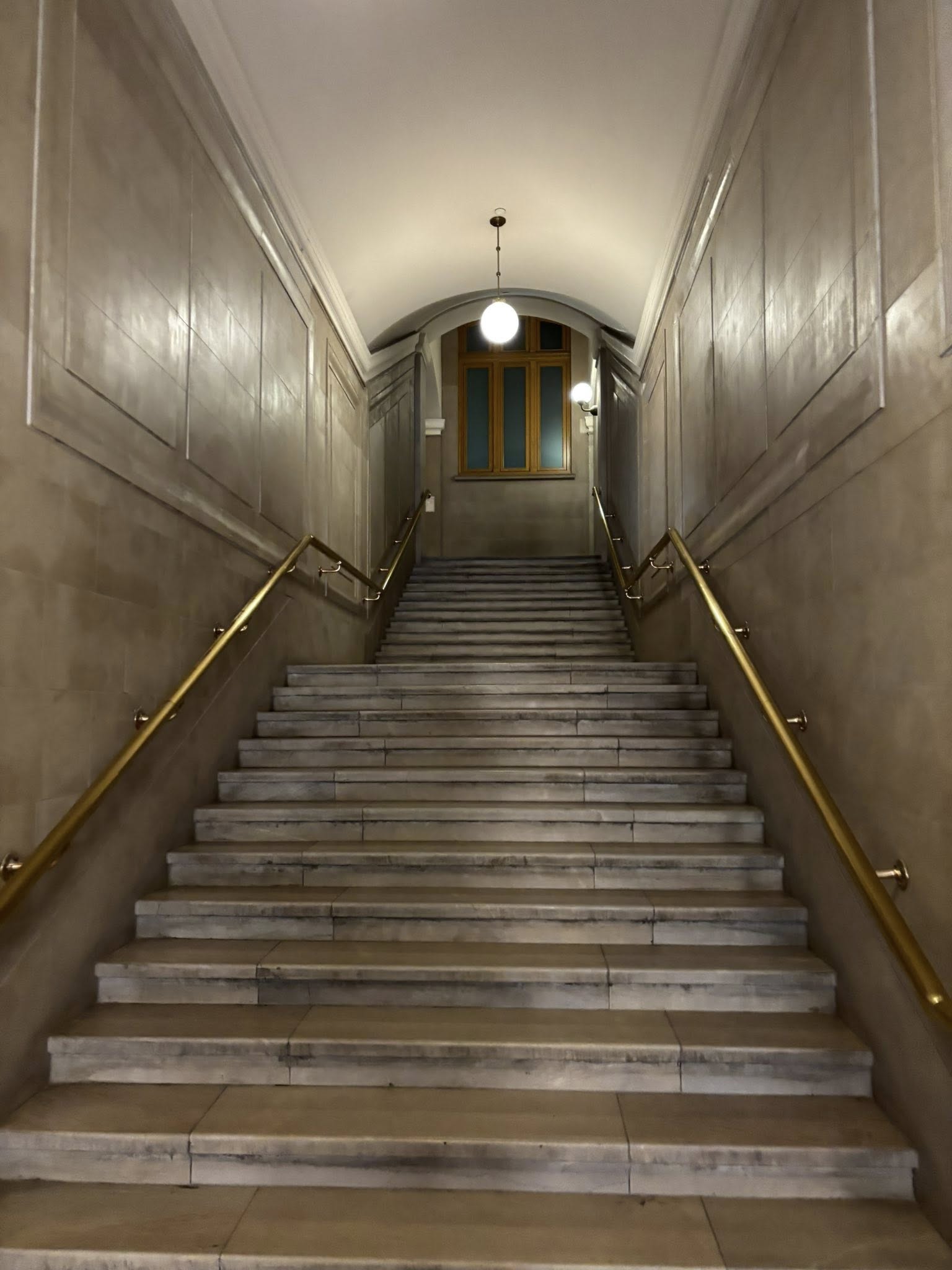 photorealistic enhancement of an existing grand staircase keep the original architecture materials and camera angle unchanged add astera ax3 lightdrop fixtures placed directly on the stair treads floor mounted not attached to walls or railings position fixtures along both sides of the staircase sitting on the steps tight against the wall spaced every 2 3 steps each fixture should be a small visible matte black unit clearly resting on the step surface angled upward to create vertical wall uplighting the light should produce a smooth cyan blue wash on the walls starting from the base of each fixture and fading upward with natural falloff ensure the light is clearly coming from the floor fixtures not from behind railings or hidden sources maintain symmetry on both sides light should softly illuminate wall panels and architectural details with subtle spill onto the stairs and brass railings style should be realistic event uplighting clean high end with accurate shadows and no exaggerated glow