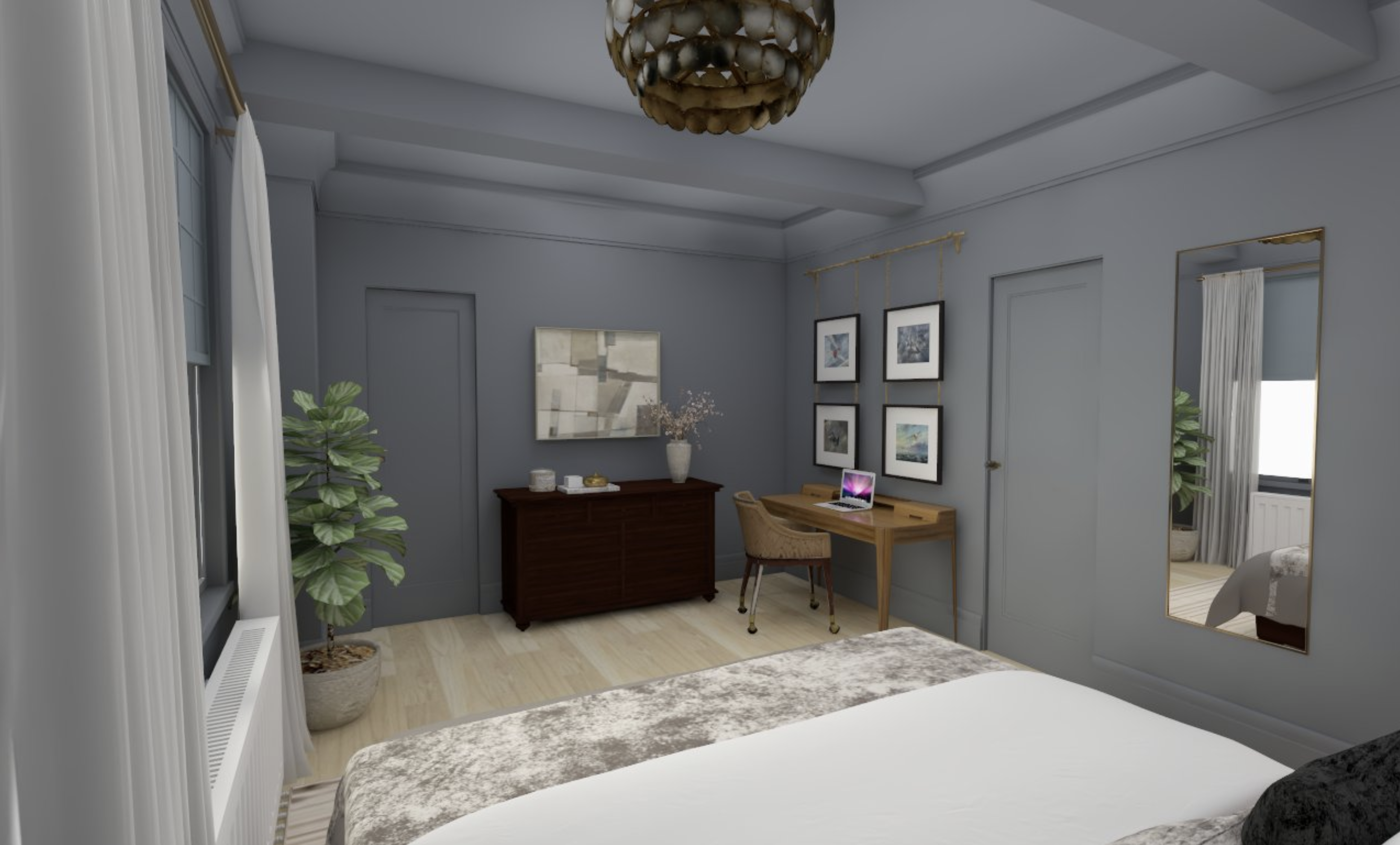 the paint is darker the ceiling is painted the view outside is another apartment building the paint color is benjamin moore 2120 40 keep the light the door is not a window its a solid door desk is a warmer brown remove the spotlight but leave the glow
