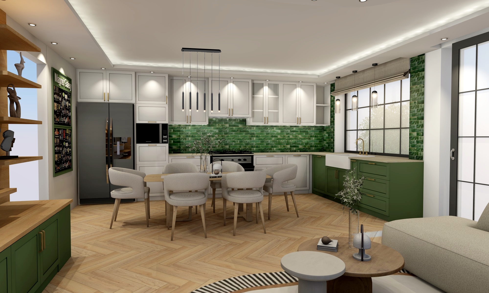 enhance and refine the image to achieve maximum photorealism improve lighting natural shadows and realistic textures while preserving the original composition and identity correct proportions add fine details to skin materials and surfaces and remove visual artifacts ensure lifelike colors accurate depth and a natural cinematic look as if captured with a high end professional camera through the window clearly show a realistic garden with natural greenery soft daylight and depth seamlessly integrated with the interior scene fill the shelves with realistic well arranged objects such as books decor items and everyday objects adding visual richness while maintaining a natural lived in appearance