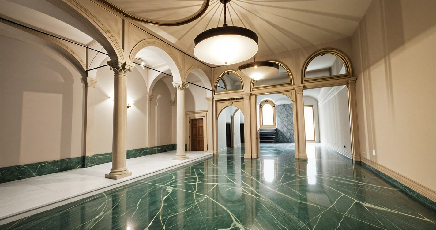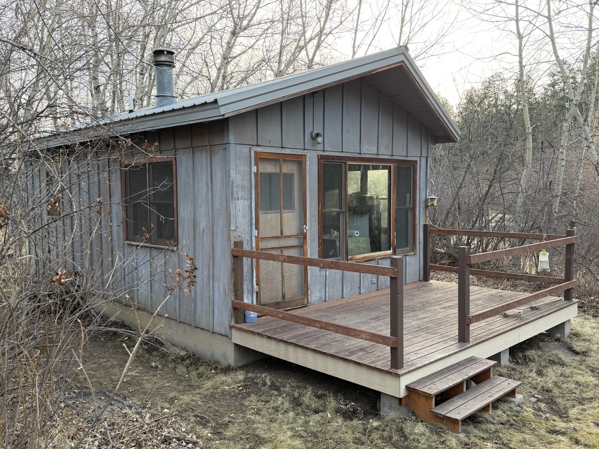 a rustic wooden cabin nestled in a serene leafless forest the cabin s exterior displays a weathered gray wood facade complemented by a soothing brown porch and railings the roof is a muted earthy gray that blends elegantly with the surroundings the forest is filled with bare trees in subtle shades of brown and gray creating a calm and tranquil atmosphere the overcast sky adds a soft diffused light enhancing the overall peaceful and cozy vibe of the scene