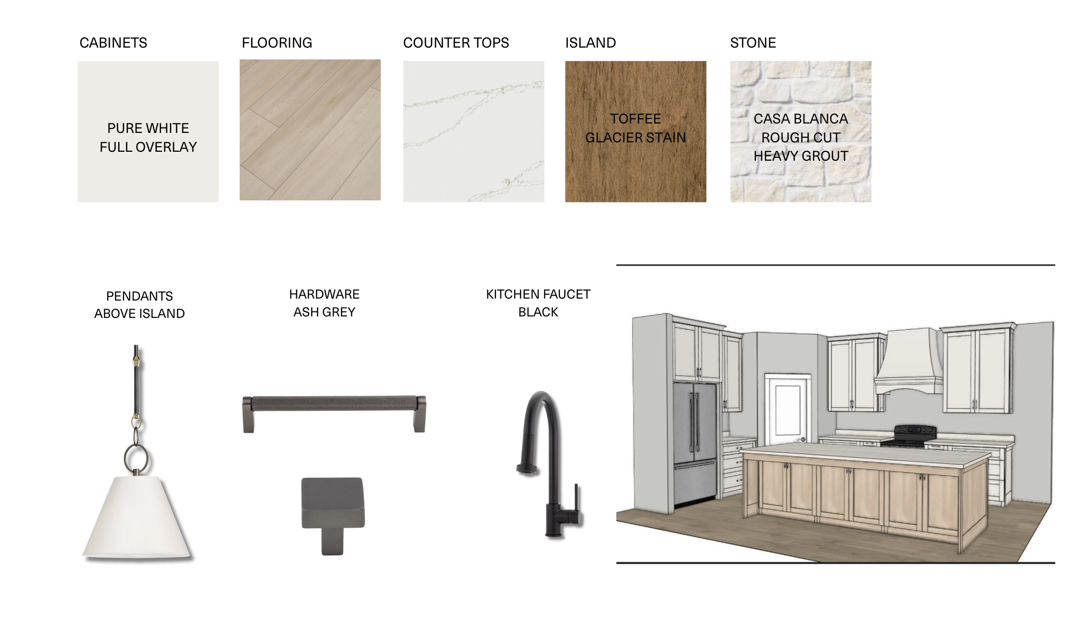 exterior shot use the kitchen rendering provided then add two pendants above the island and black hardware to the cabinets add a black sink faucet the perimeter cabinets are white the island is stained