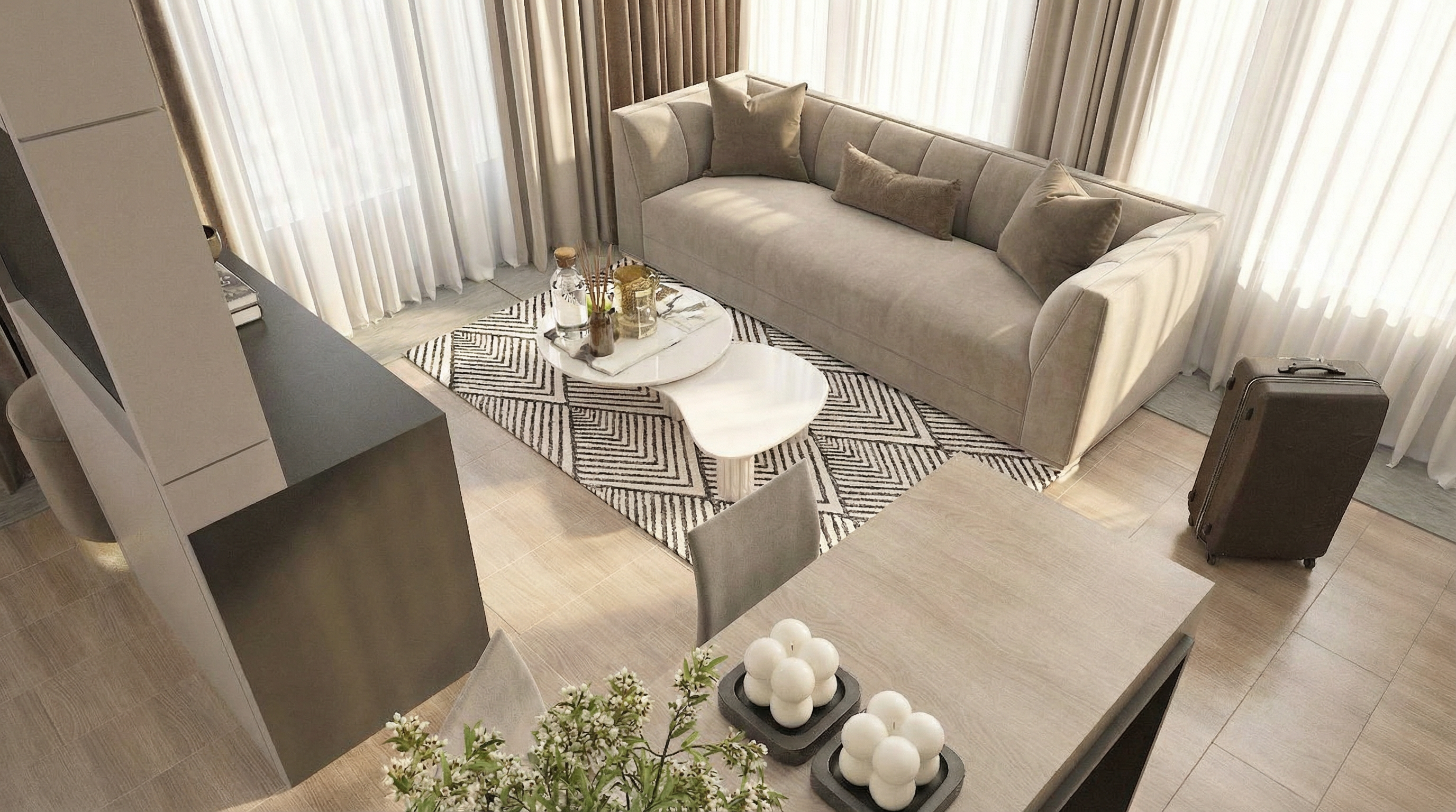 render this kitchen using exact layout as the picture lighter wood tone delete sink beside dishwasher replaced with kitchen range remove sink at left hand side wall lighter wood tone even lighter wood tone white marble waterfall at island