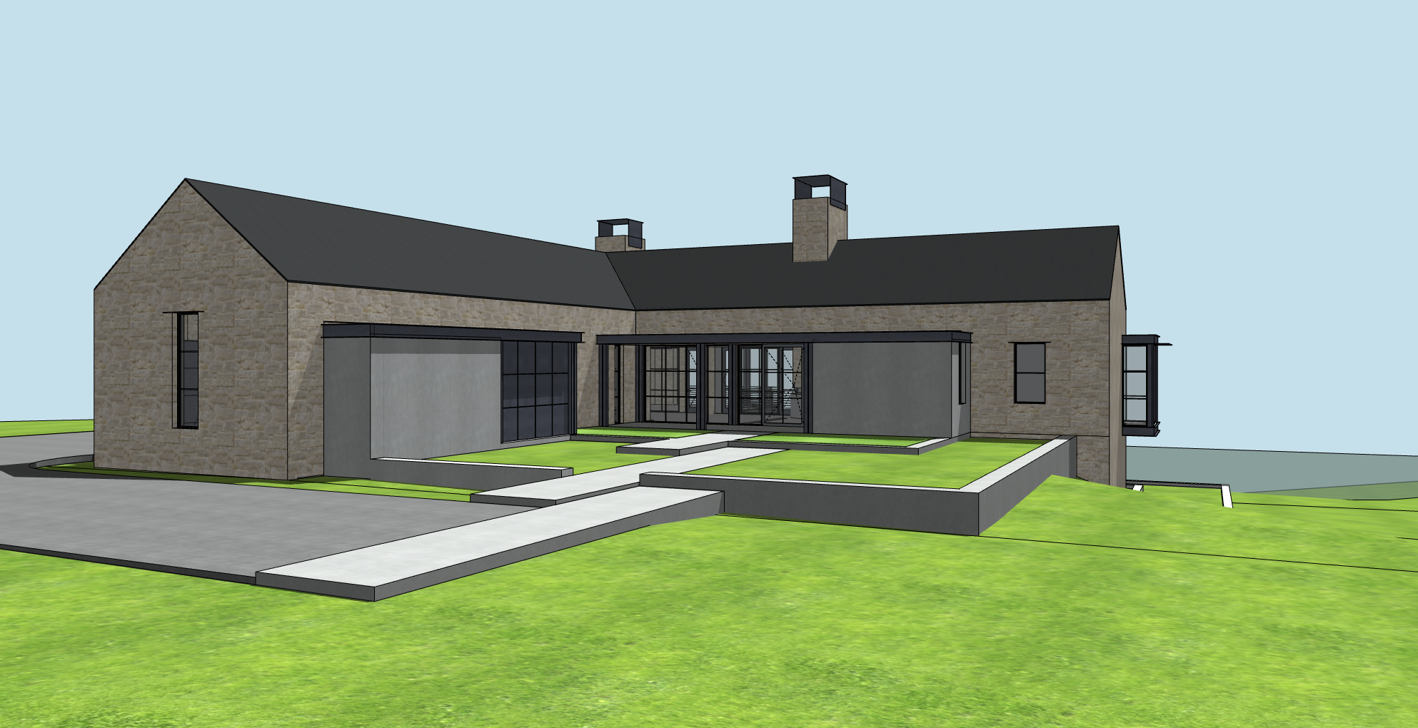 lake in background several trees on right side standing seam metal roof