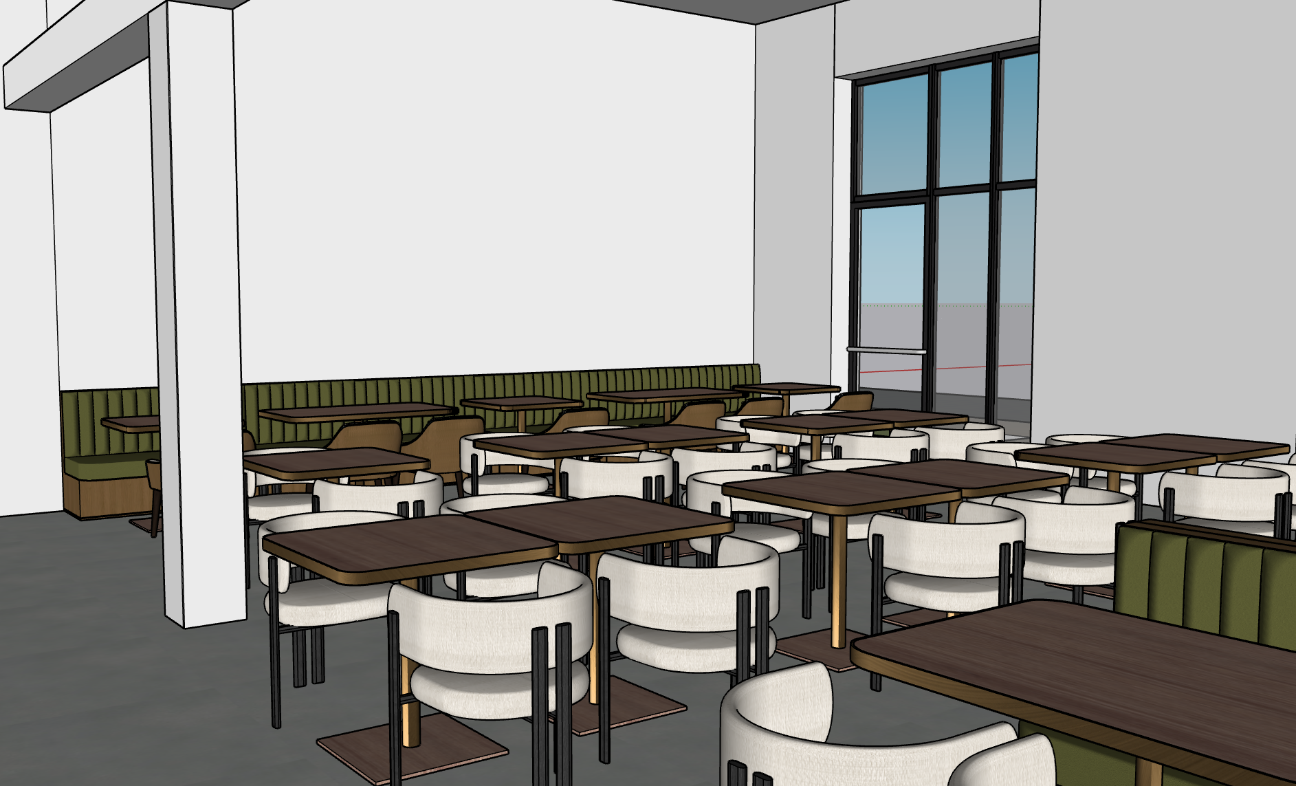 exterior shot photorealistic architectural interior render of a modern restaurant strictly based on the provided 3d model do not modify layout geometry proportions dimensions furniture placement or camera angle maintain the exact spatial composition and perspective scene description dense dining layout with square dark wood tables arranged in a precise grid each paired with four rounded upholstered chairs in light cream fabric with black metal legs along the back wall include a continuous green banquette with vertical channel tufting perfectly aligned with the original model preserve exact spacing and alignment between all elements architecture maintain tall white walls clean ceiling and visible structural column in the foreground on the right side include floor to ceiling windows with thin black metal frames matching size and position exactly flooring must be smooth neutral gray concrete materials high realism dark walnut wood tables with visible grain and subtle gloss soft woven fabric upholstery chairs and banquette with fine texture matte painted white walls black powder coated metal details slight imperfections edge wear and micro surface variation for realism lighting very important use natural daylight coming from the right side windows soft and diffused add global illumination soft shadows and realistic light falloff include subtle volumetric light rays and ambient bounce light balanced exposure with hdr lighting no overexposure rendering style ultra realistic architectural visualization quality clean and minimal aesthetic sharp details accurate reflections soft shadows realistic depth 8k resolution ray tracing global illumination ambient occlusion camera locked to original view same eye level lens framing and composition no changes in field of view or perspective negative constraints no redesign no added objects no removal of elements no change in layout no stylization no exaggerated forms