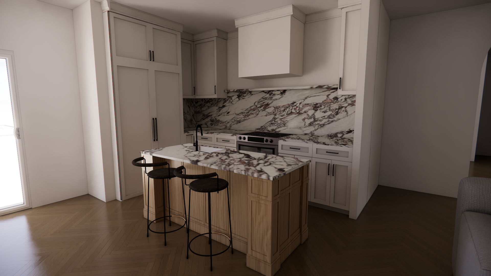a cozy and modern kitchen interior with an open inviting atmosphere natural oak wood flooring in a warm medium brown tone the kitchen cabinets are painted in a soft creamy beige to enhance warmth and simplicity marble countertops and backsplash have an elegant pattern with shades of white gray and subtle maroon veins add sleek black hardware and fixtures for a modern contrast use warm natural light to emphasize the texture of marble and wood creating a welcoming and stylish aesthetic