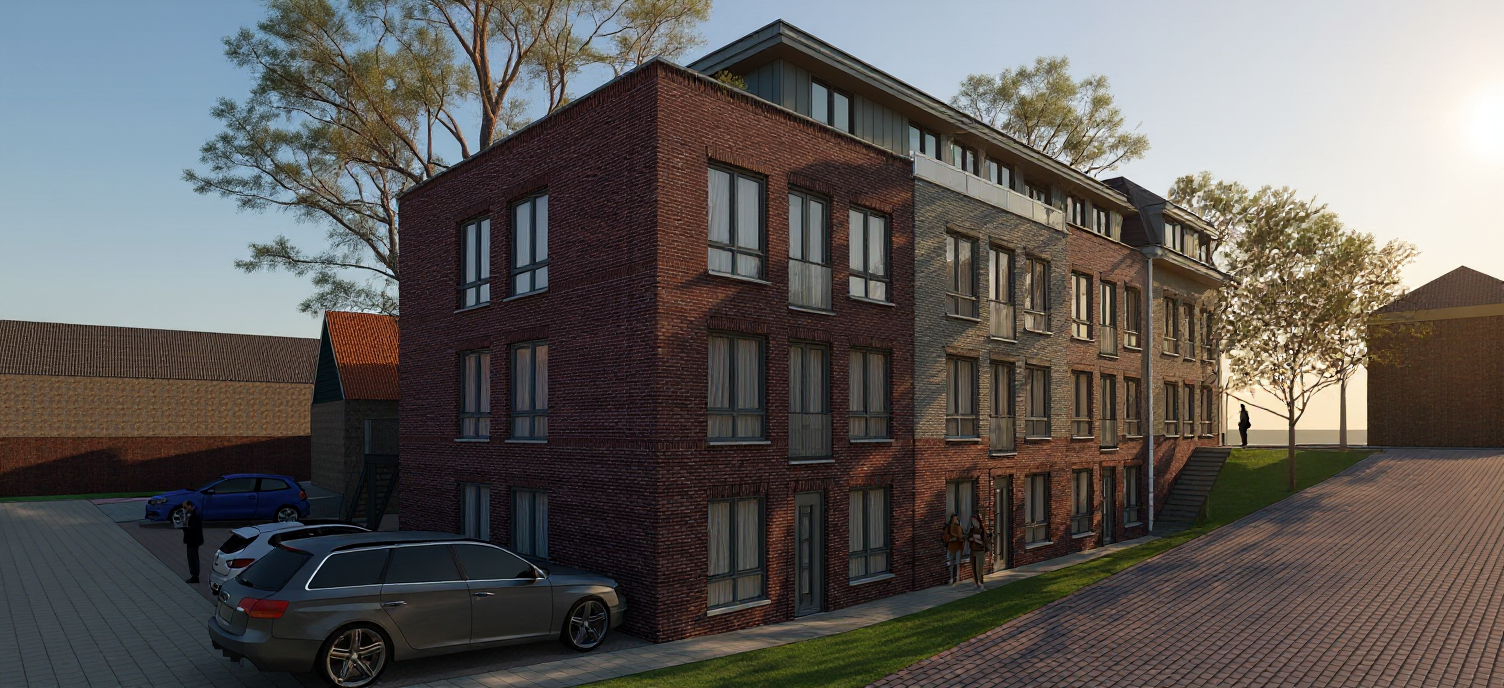 blue sky with less sun with realistic brick finish and soft landscaping as front lawn architecture