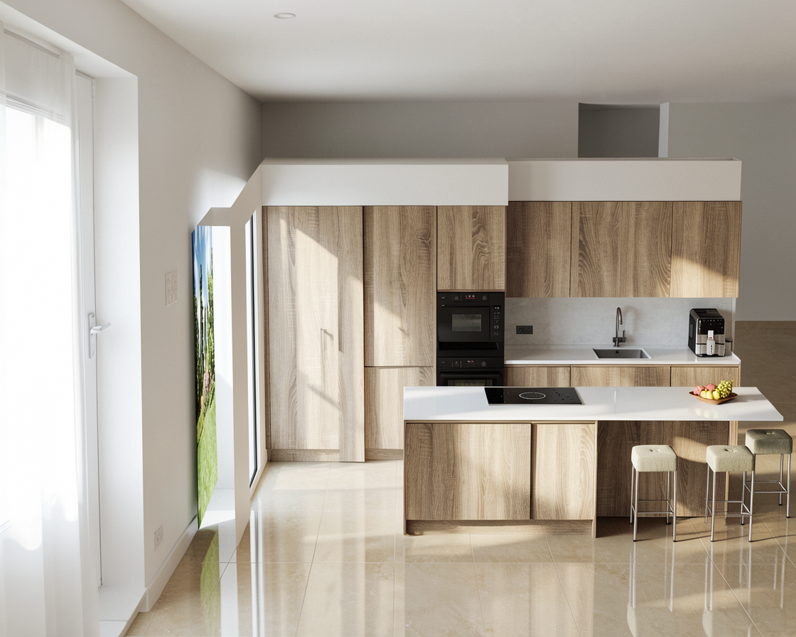 french country manor cream stucco with a light brown roof cream limestone black windows a light brown front door a manicured lawn with pine trees scattered behind mountains behind the trees native shrubs and flowers in the landscaping a soft blue sky with white clouds that soften the scene