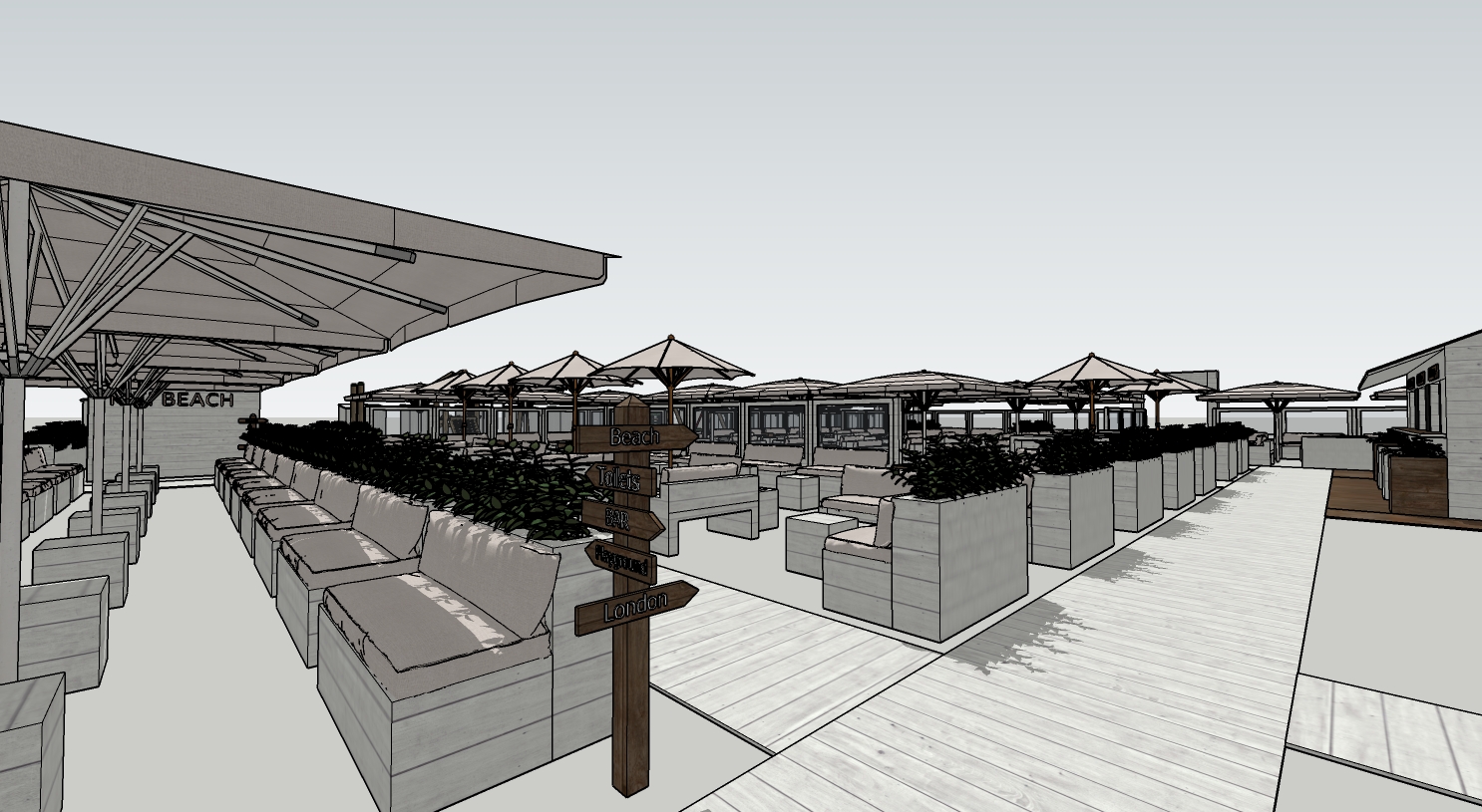 het betreft een strand bar voorzie mooi wit geverfde houten planken graag fotorealistisch in de verre achtergrond rechts is de zee graag toevoegen van veel mensen die genieten van een lekkere cocktail en aan de bar staan aan te schuiven in strandkledij gelieve enkel vrouwelijke knappe jonge personen toe te voegen in de uitwerking betreft een strandbar op het strand het zijn niet overal houten planken gelieve tekening aan te houden
