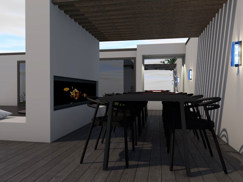 render a modern garden with a dining table in a shadow area a fireplace in the left wall sunny weather