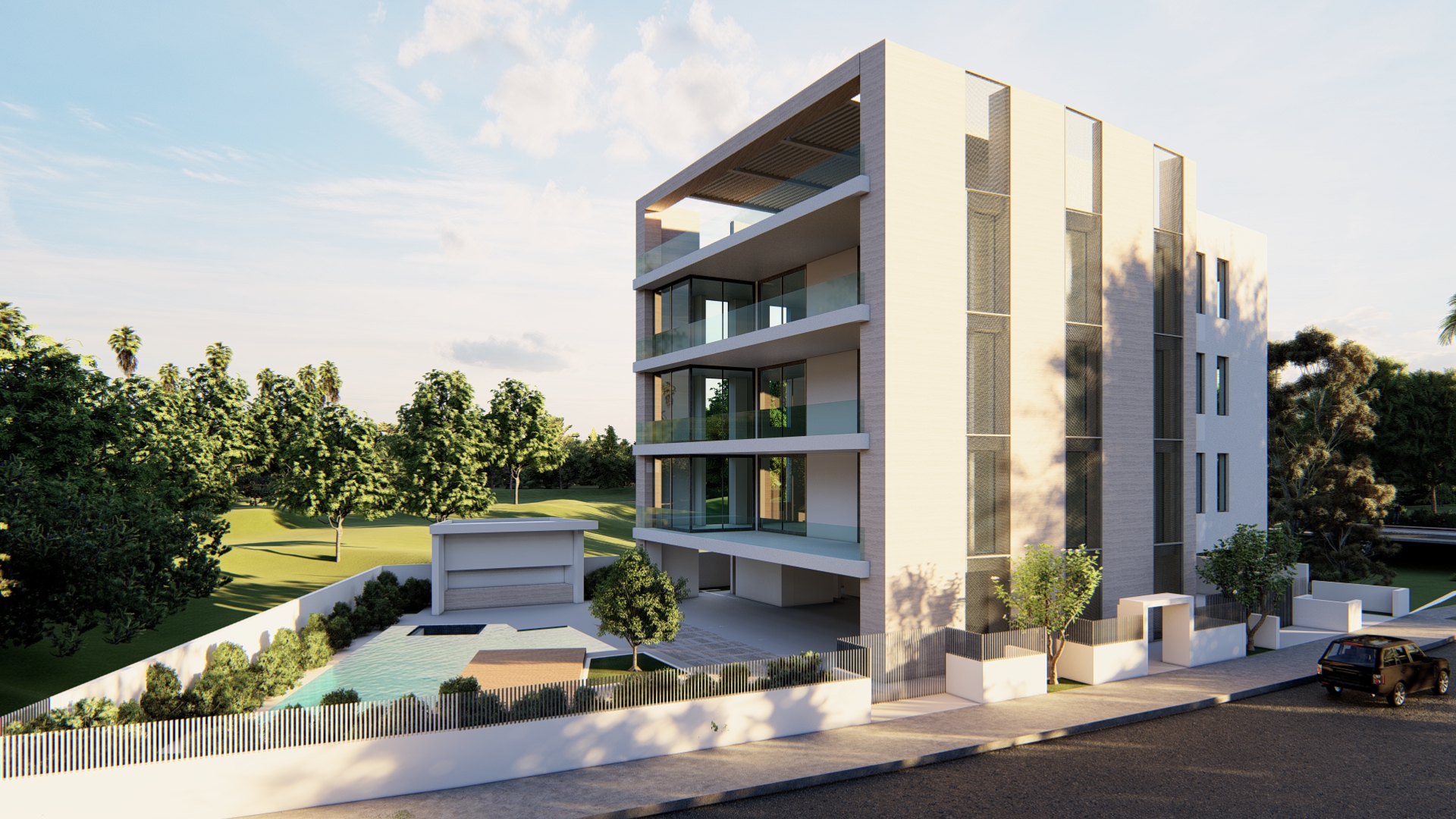 travertino claddering perforated metal panels some cars people
