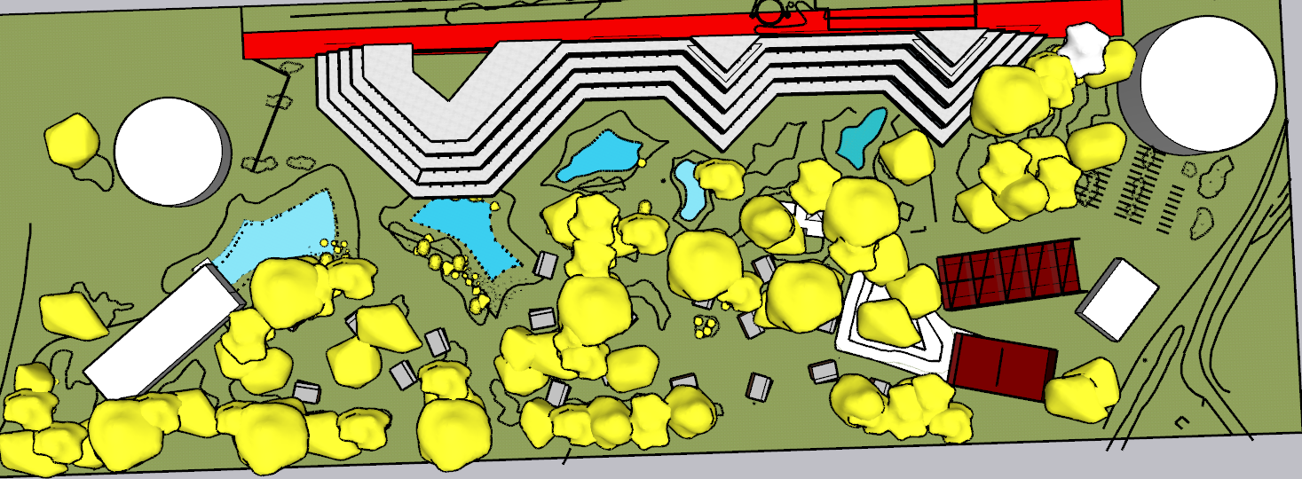 keep the shapes convert this image into an aerial view distinguish the yellow as vegetation mediterranean pines it is a space near the coast the red is the street and the maroon are tennis courts