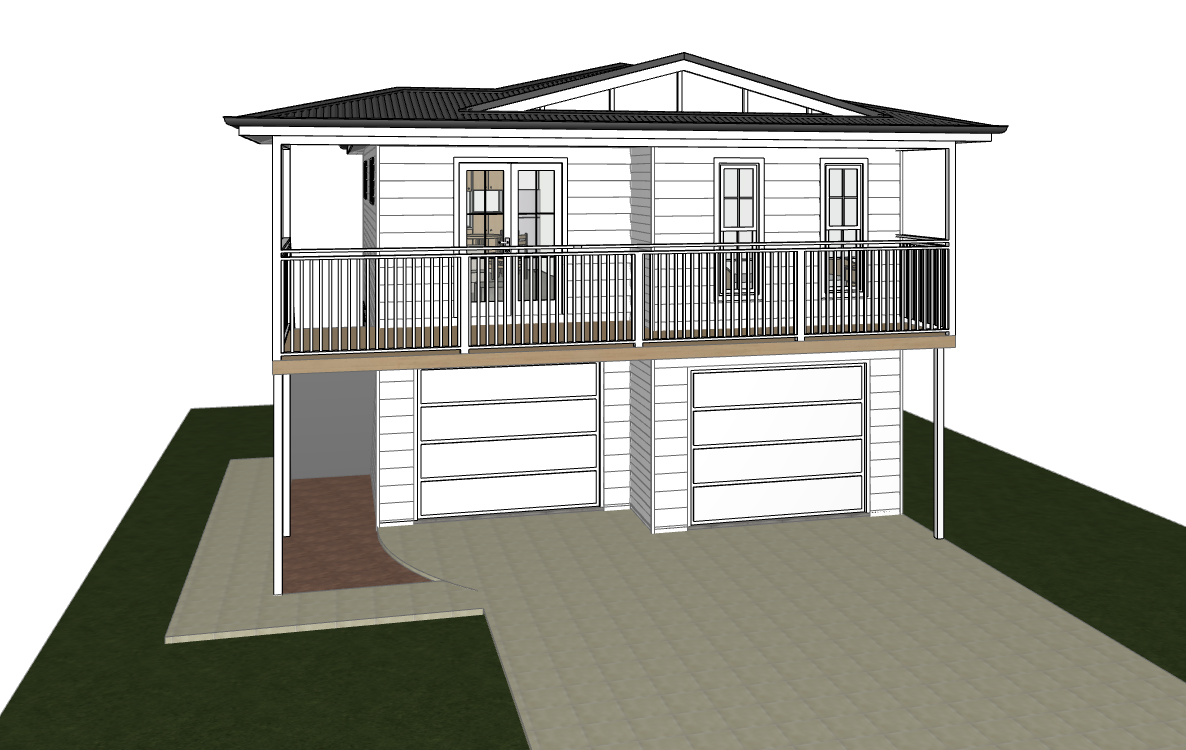 render a photorealistic 3d perspective of this house maintain original model colours do not change the view only enhance the current materials and make the landscape nicer vegetation include small hydrangea like bushes beneath the deck in the section where you can see a bit of the dirt driveway to be a light concrete color that extends with the pedestrian path setting should be in a suburban australian landscape