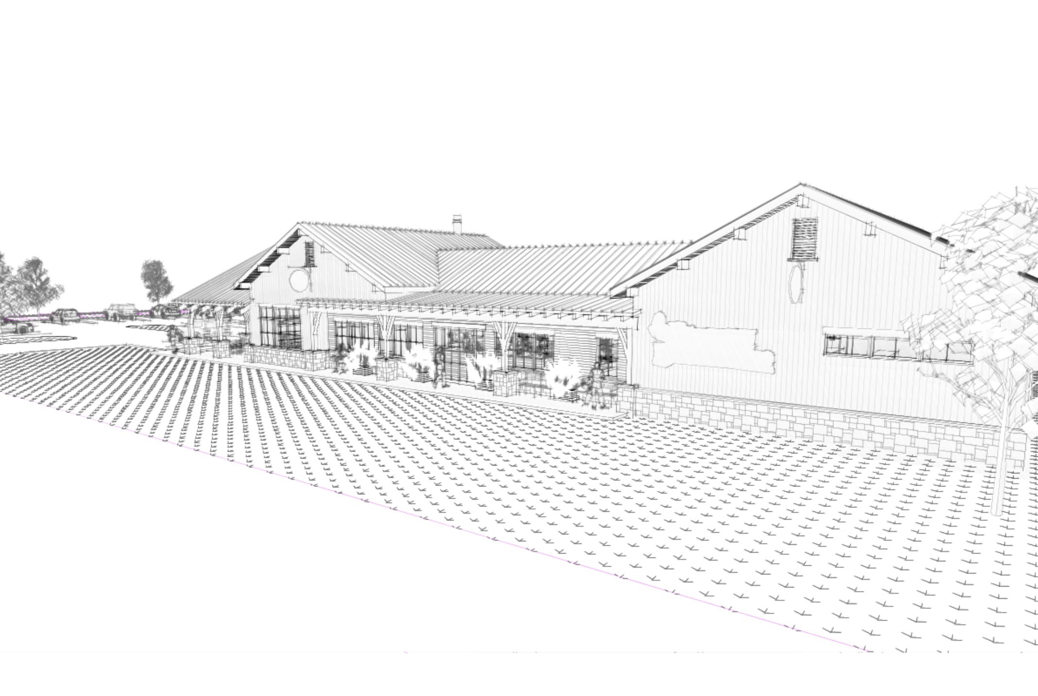 grainy watercolor render of timber frame building with reclaimed wood siding and stone wainscot watercolor trees and urban environment in the background extensive watercolor landscaping surrounding the building parking lot in the background architecture