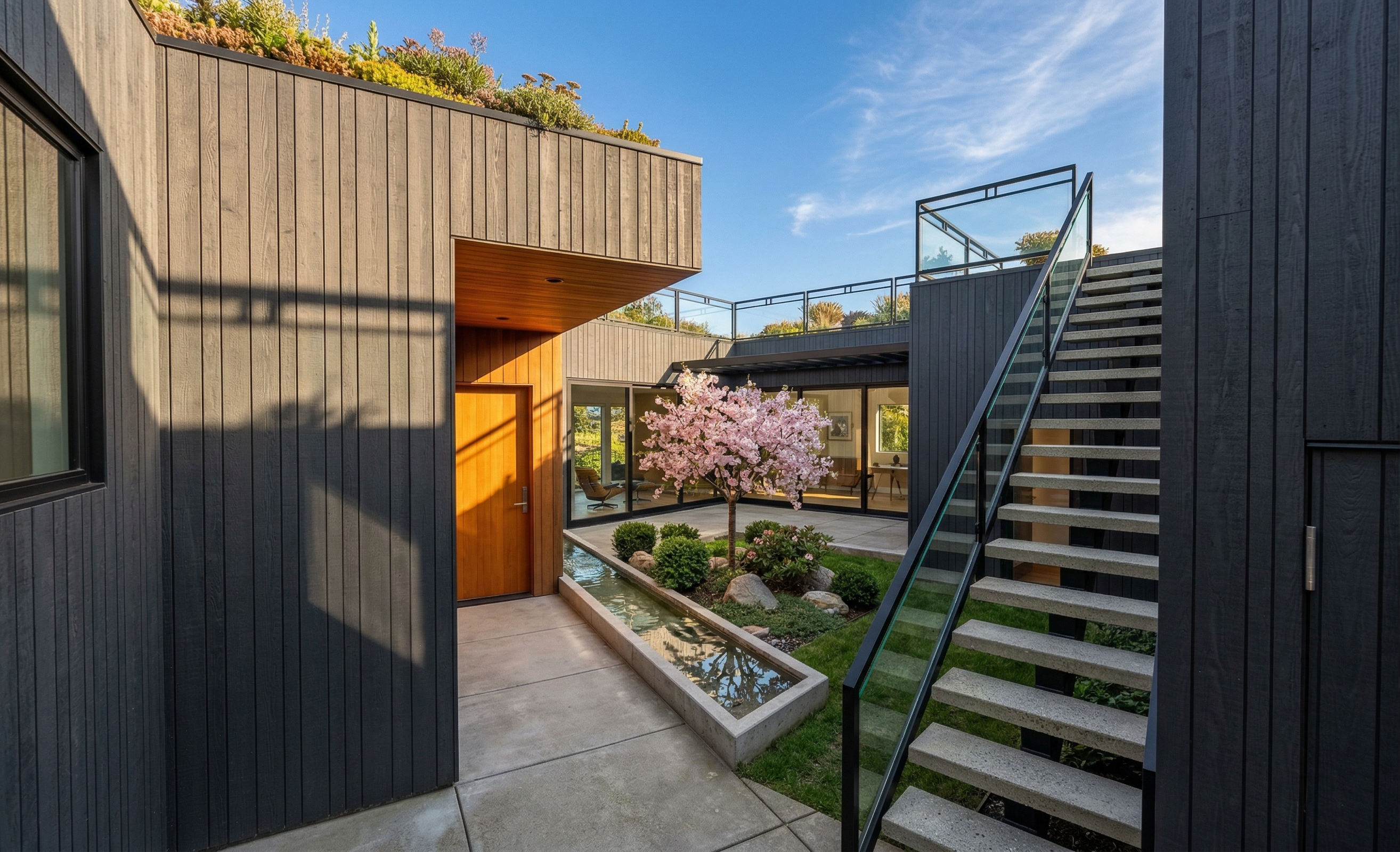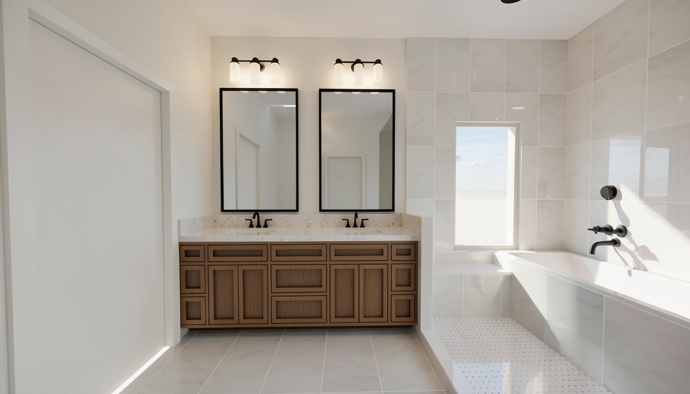 photorealistic architectural interior render of a public bathhouse reception area wide angle perspective view the space features a reception desk on the left with a dark veined marble or granite fascia white countertop surface and vertical fluted warm walnut wood laminate lower panels with small brass drawer pulls two matte charcoal dome pendant lights hanging on black metal rods from the ceiling a freestanding vertical slat screen divider made of thin white painted rods suspended from a warm walnut oak header beam and base acting as a spatial partition two small tub lounge chairs in dark charcoal woven upholstery with tan leather seat cushions on light oak tapered legs arranged around a small round light wood side table a low dark marble coffee table in the foreground center a large upholstered sofa in warm dusty rose or mauve leather in the foreground right two brass wall sconces with frosted globe shades mounted on the white walls casting soft warm halos multilingual wayfinding signage in small dark text on the white wall near a dark framed interior door ceiling is a large perforated terracotta red orange decorative panel with organic irregular oval cutouts backlit by warm natural daylight filtering softly through the perforations casting dappled warm amber and peach light pools across the white walls and floor below light is diffused and gentle not harsh floor is realistic light oak wide plank hardwood with clearly visible wood grain natural knots and plank seams running horizontally warm blonde tones all artificial lighting from pendants and sconces is soft warm and ambient low contrast no sharp or overexposed hotspots mimicking incandescent bulbs at dusk overall mood is warm intimate and spa like analog film grain kodak portra 400 film scan aesthetic slight vignette at edges muted warm palette of terracotta cream walnut charcoal tan brass and mauve editorial interiors photography quality medium format camera do not change the original materials