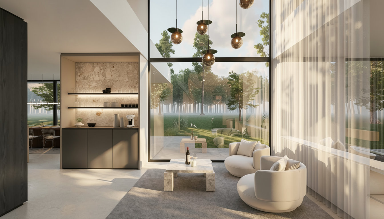 render in a realistic way with natural light raking in from the left french door the walls are white and the floors are natural white oak the rug is a light tan woven wool make the rug a circle the curtains are light grey linen the bar in the left corner is chrome with glass shelves and the brown leather chair has a chrome frame make the rug pattern linear left to right softened the edges of the grey ottoman and make it a boucle texture make the curtain rod black the side table next to the ottoman should be in a chrome finish keep everything the same from the last render but the door on the far left is solid white with no hardware and the rug pattern is linear left to right also make the sunlight not so bright